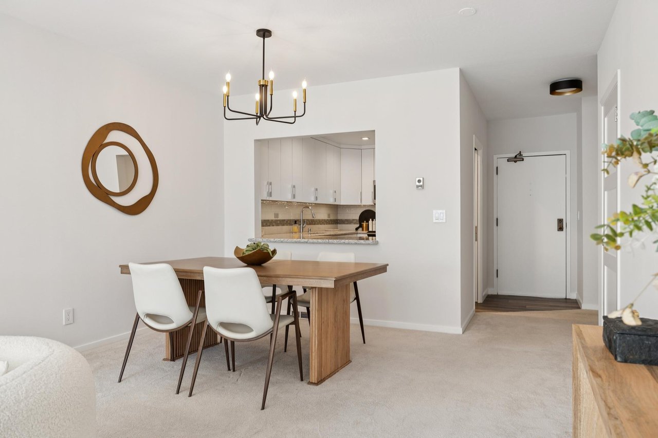 The open living and dining area is anchored by a brick fireplace with an adjacent alcove perfect for display or extra storage, while generous windows frame views of California Street and fill the space with natural light throughout the day. New light fixtures at the entry and dining areas add a polished, contemporary touch.