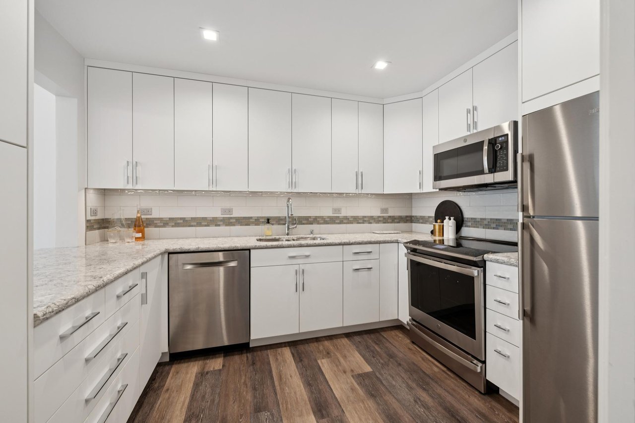 The kitchen strikes a smart balance between function and style. White cabinetry with silver hardware provides ample storage, while under-cabinet lighting illuminates granite countertops accented by a subway tile backsplash with a glass mosaic strip detail. A pass-through bar connects the kitchen to the living and dining area, equally suited as a breakfast bar for casual morning coffee. A new GE Profile five-burner electric range leads the cooking setup alongside a Bosch dishwasher, GE Profile microwave, and Blomberg refrigerator, and wide-plank luxury vinyl flooring in a warm multi-tone wood finish ties the space together.