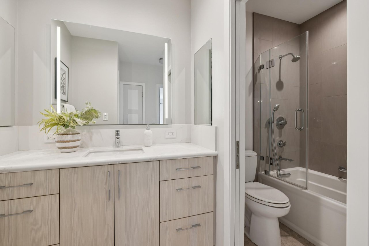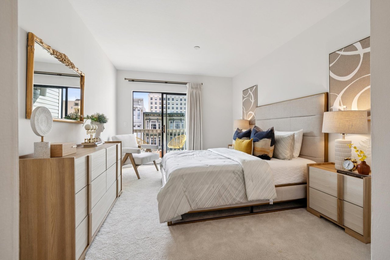 The bedroom is a genuine retreat. Dual closets with mirrored sliding doors greet you at the entry, one fitted with customizable shelving. A covered balcony off the bedroom overlooks California Street, offering an elevated perch above the City sights. Additional hall and linen closets between the bedroom and bathroom provide the kind of storage that San Francisco condos rarely deliver.