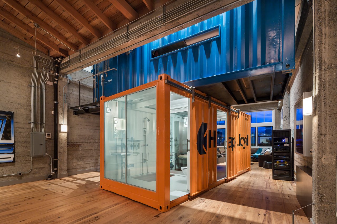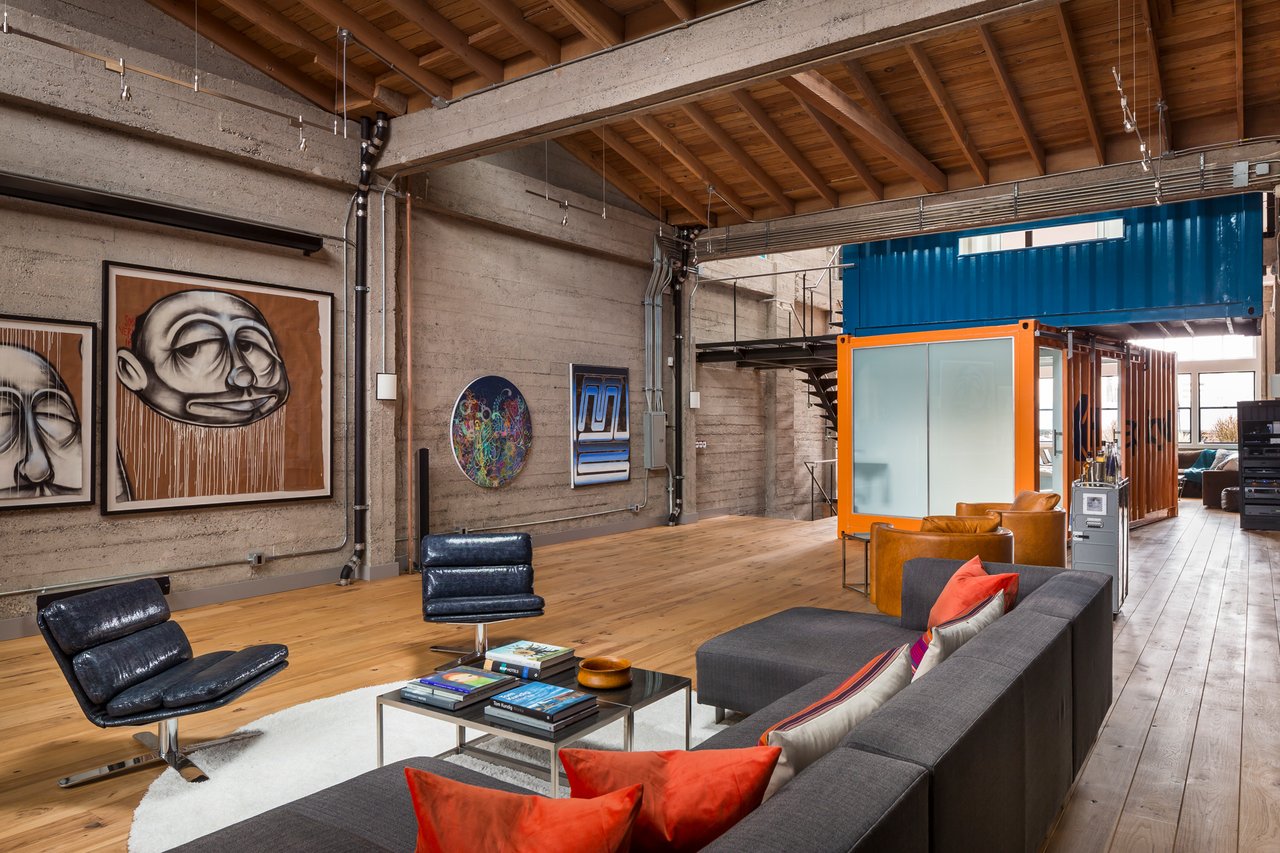 A Dwell-featured triumph of adaptive reuse, 2230 Bush Street transforms a former Chinese laundry and tooth-powder factory into an architecturally arresting Lower Pacific Heights residence. This extraordinary loft—with the presence and proportions of a single-family home—offers approximately 3,600 square feet of voluminous living space crowned by ~17-foot ceilings and anchored by two custom, internally suspended shipping containers that function as sculptural design elements.