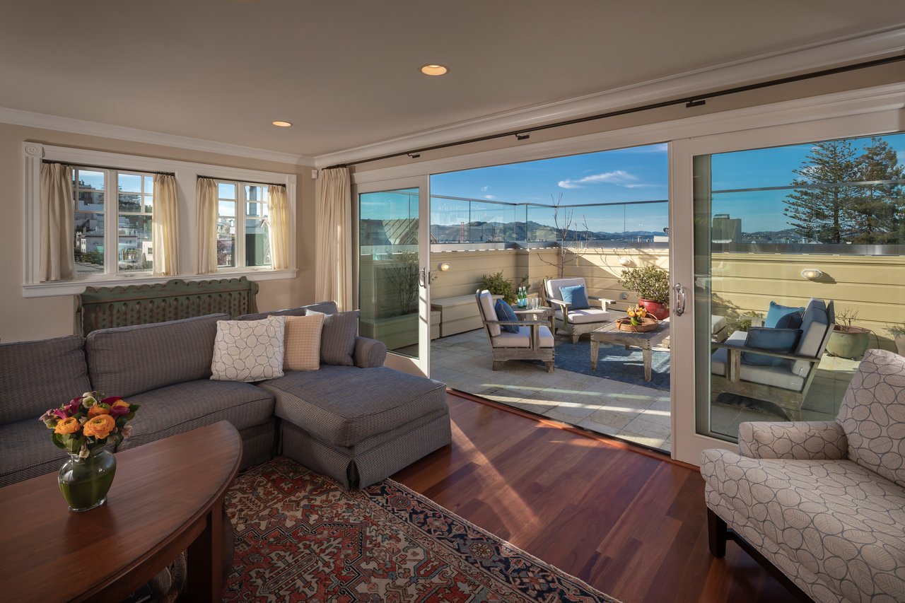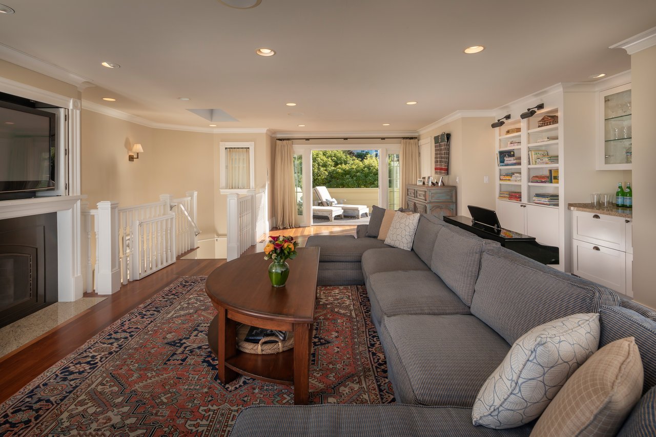 An impressive pent room crowns the home, offering effortless indoor–outdoor flow and sweeping views of the Golden Gate Bridge—an extraordinary setting for both entertaining and everyday living. Additional highlights include two fireplaces, a versatile first-floor suite ideal for an au pair, guest quarters, or a home gym, as well as comprehensive seismic upgrades completed in 2005.