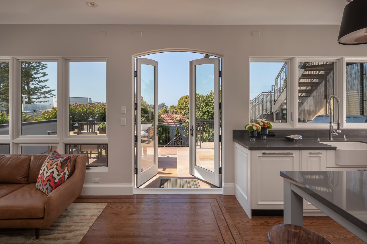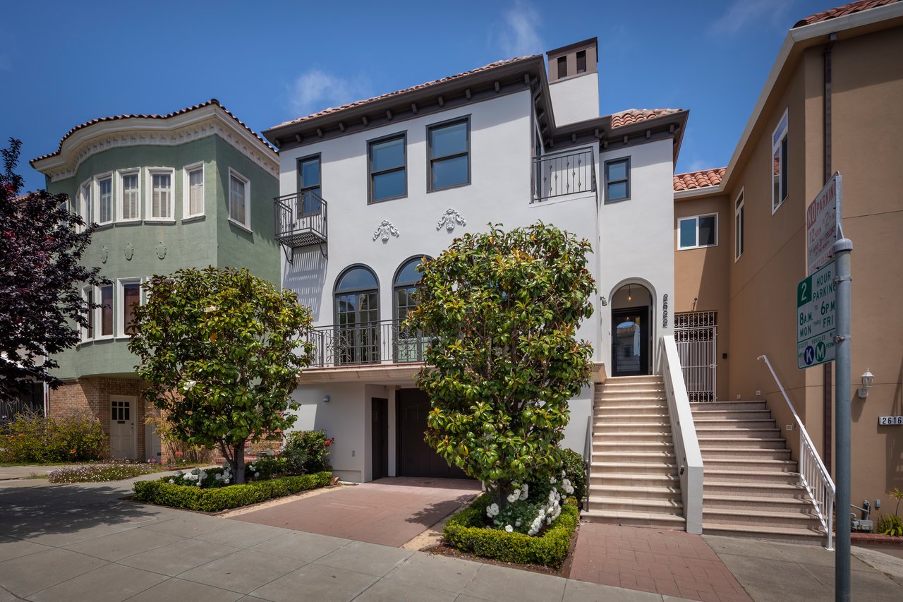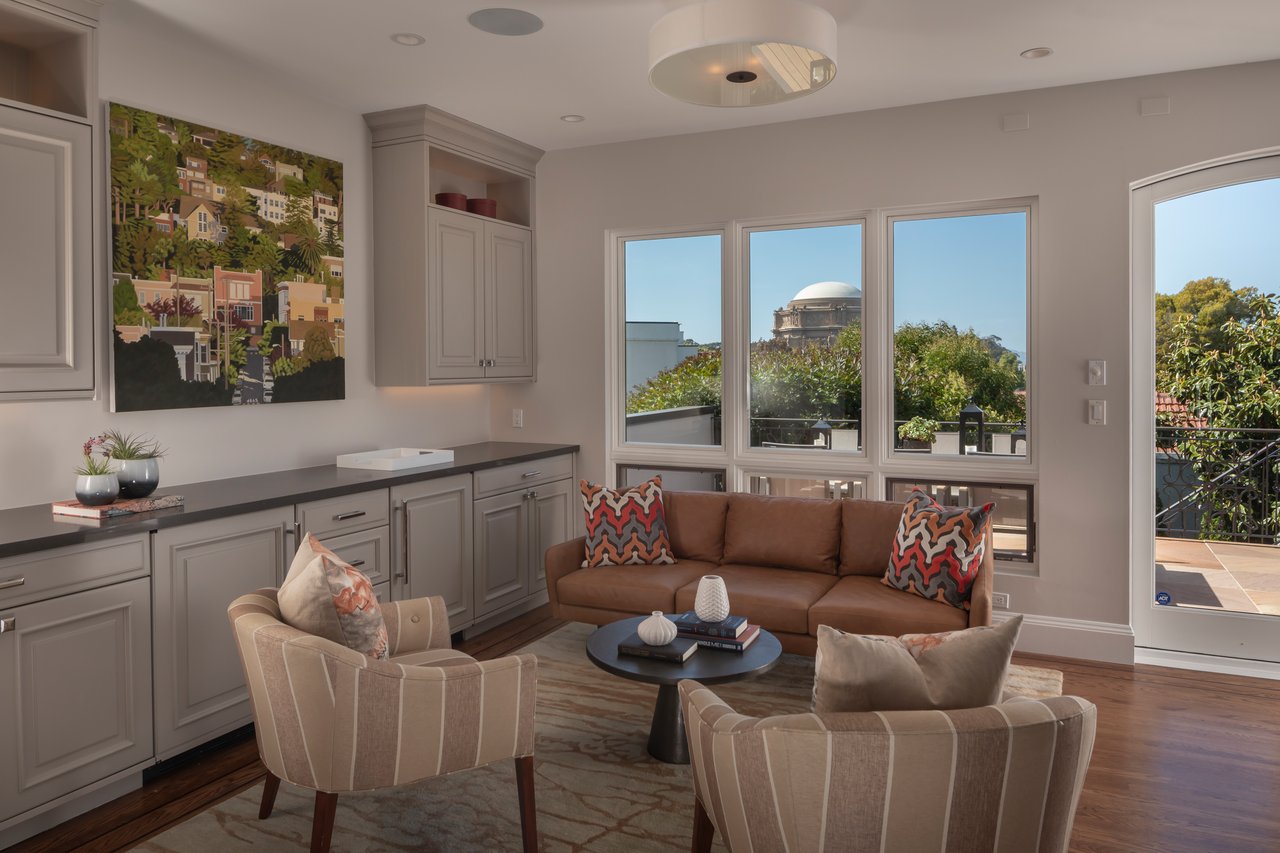 This stunning 5-bedroom, 4.5-bath Cow Hollow single-family home offers exceptional construction quality, remarkable quiet, and sweeping San Francisco views—including the Palace of Fine Arts and the Golden Gate Bridge. The newly renovated chef’s kitchen features a Wolf gas range, dual Thermador ovens, a large island with seating, and an adjacent family room complete with a wet bar, wine cooler, and beverage center. The kitchen and family room open seamlessly onto an expansive sun deck with a plumbed gas grill, perfect for indoor-outdoor entertaining.