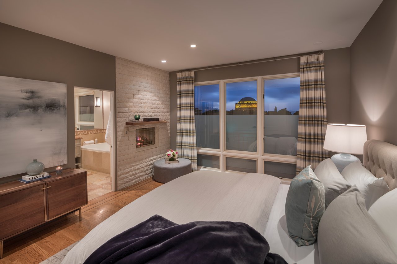 Generous formal living and dining rooms create an ideal setting for hosting gatherings. The top-floor primary suite boasts iconic views, dual walk-in closets, a gas fireplace, and a luxurious bath with a jetted tub and separate stall shower. Two additional en-suite bedrooms are located on the same level.