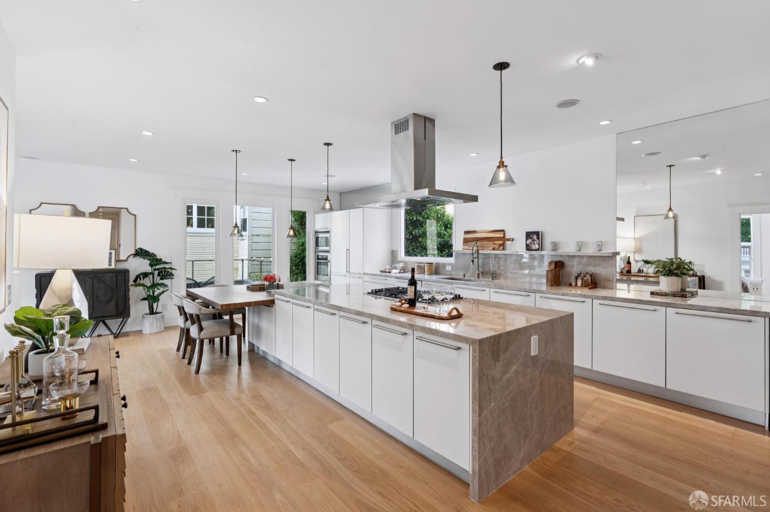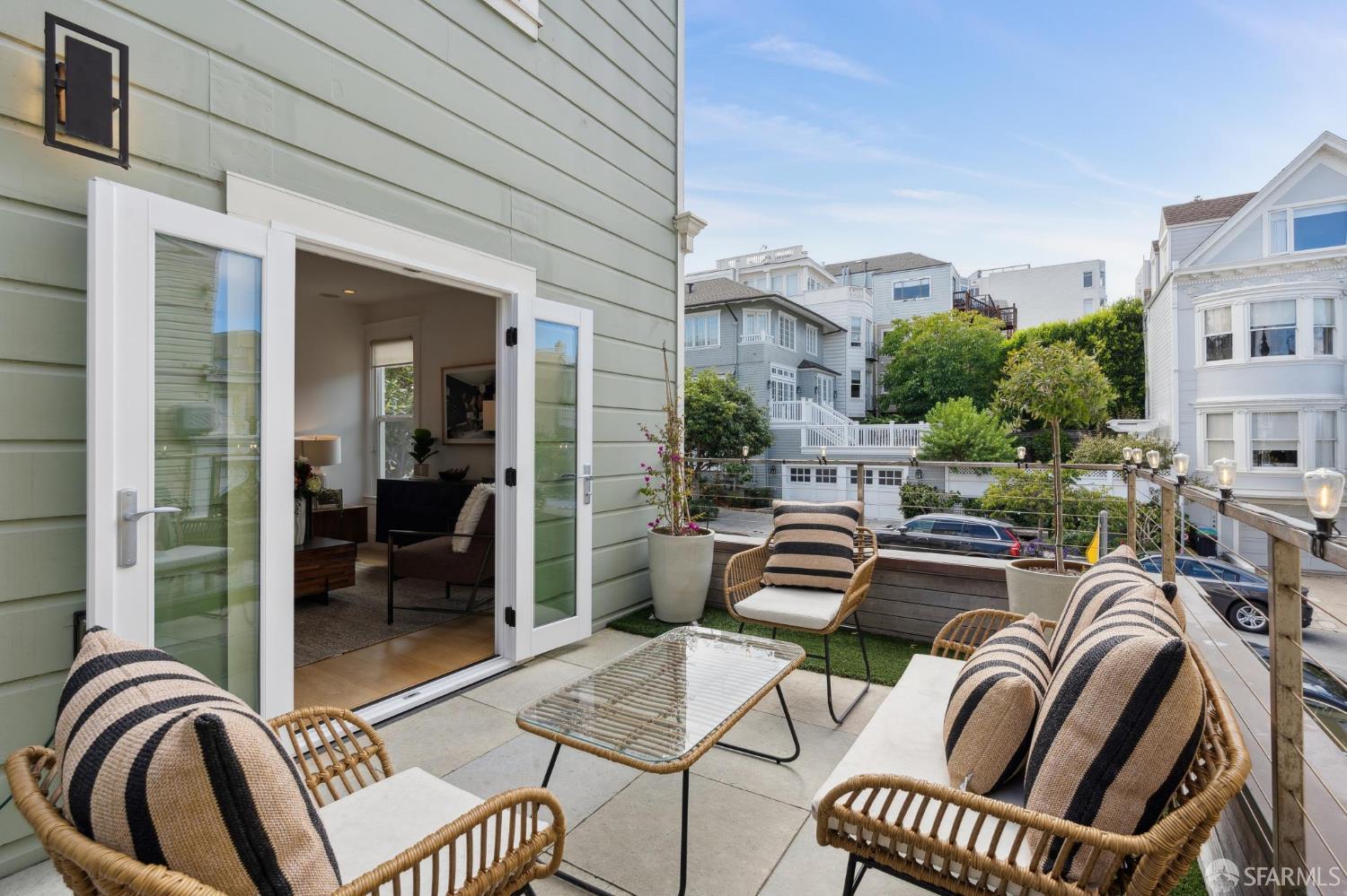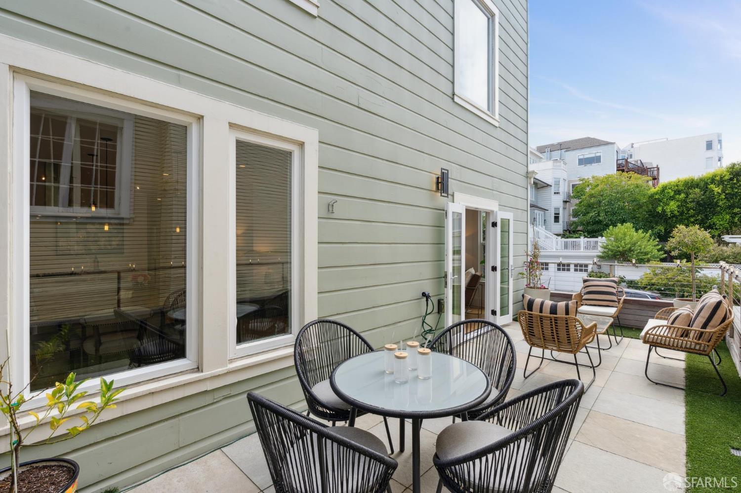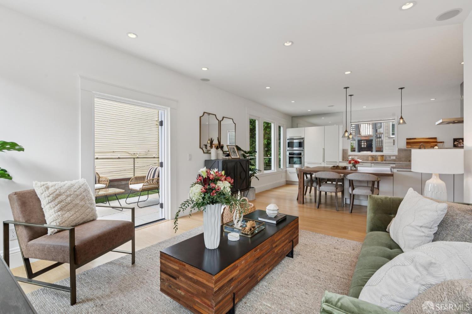 This sophisticated Cow Hollow TIC offers 2 bedrooms, 2 bathrooms, and an open entertainment-style layout steps from the boutique shopping, dining, and nightlife of Union and Fillmore Streets. Uniquely, the residence enjoys the exceptional privilege of a deeded walk-out patio, seamlessly extending the living space outdoors. This home has been thoughtfully upgraded with bespoke, high-end finishes throughout. The kitchen stands as a centerpiece, enhanced with quartzite Taj Mahal countertops, a new range, and a full Bosch appliance suite. An expanded deep sink and generous island with an integrated dining table anchor the space, creating a true gathering hub where the kitchen, living, and dining areas flow together in perfect harmony. The private quarters are equally refined. The primary suite bath has been fully reimagined with custom finishes and a large shower over tub while the hallway guest bath impresses with a custom vanity and a walk-in shower. Additional enhancements include wide-plank white oak hardwood floors, double-pane French doors leading to the spacious patio, dual-zone radiant heating, recessed lighting, built-in Sonos speakers, in-unit washer and dryer, one car parking, and generous storage. The building underwent a soft-story seismic retrofitting in 2018.
