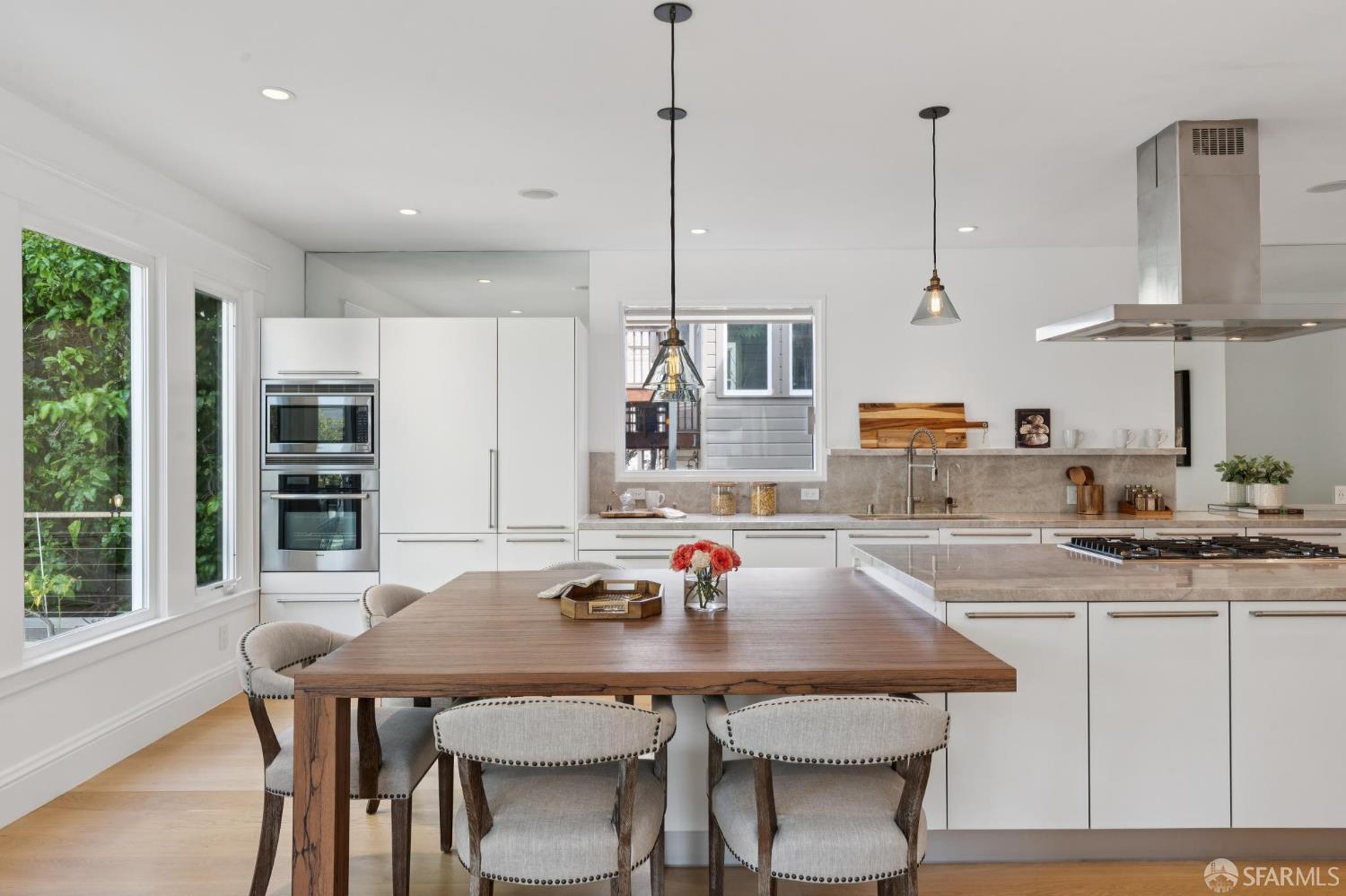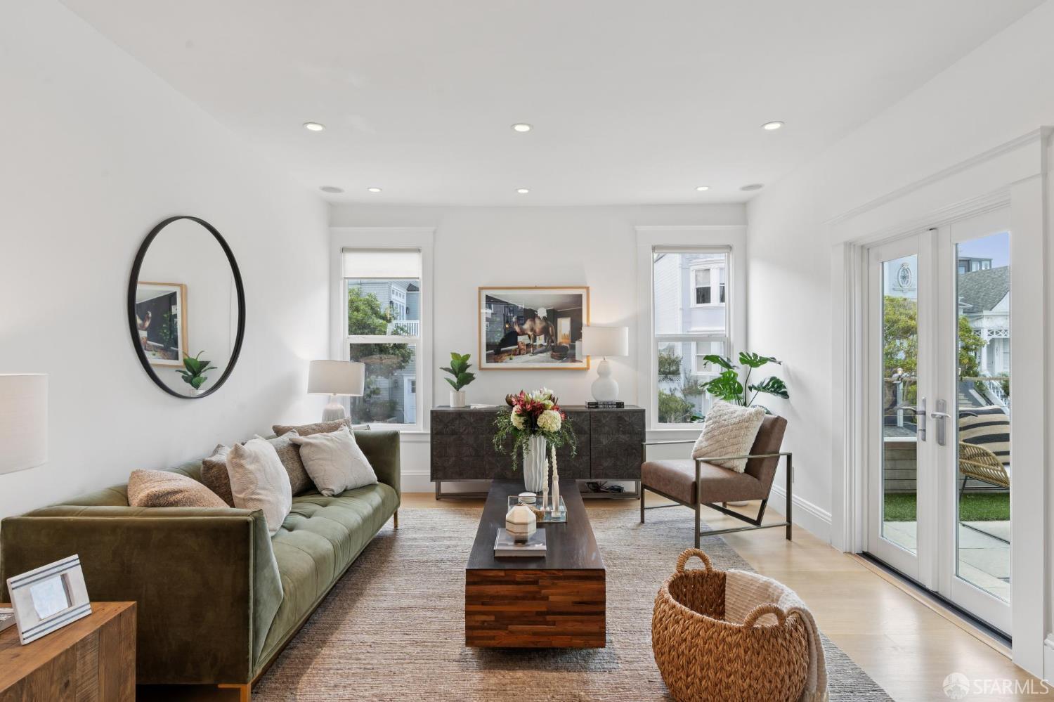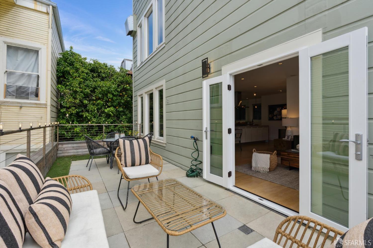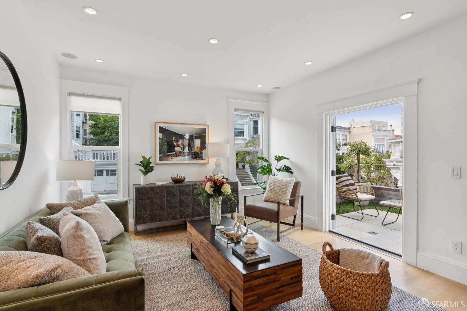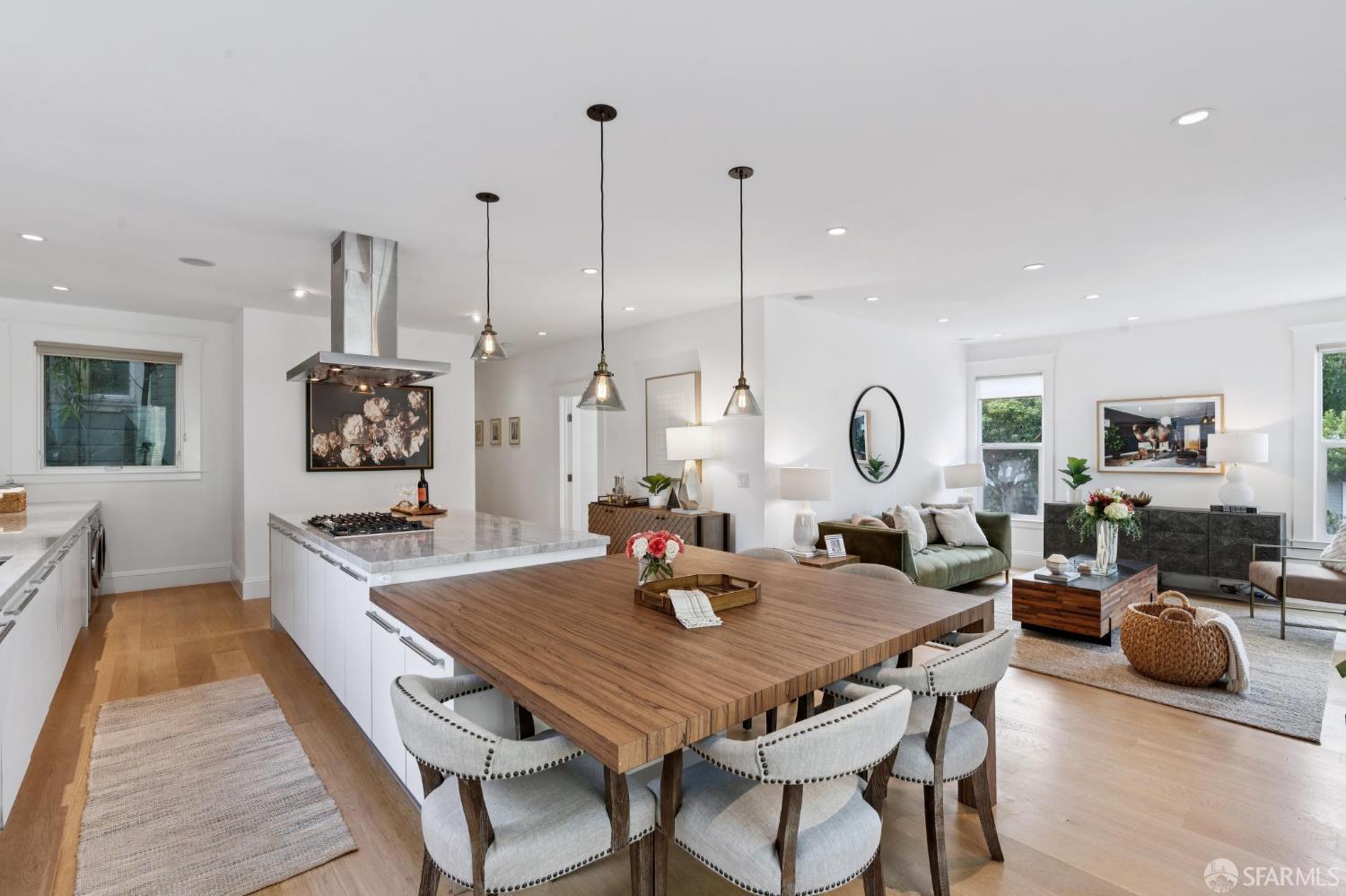 This sophisticated Cow Hollow TIC offers 2 bedrooms, 2 bathrooms, and an open entertainment-style layout steps from the boutique shopping, dining, and nightlife of Union and Fillmore Streets. Uniquely, the residence enjoys the exceptional privilege of a deeded walk-out patio, seamlessly extending the living space outdoors. This home has been thoughtfully upgraded with bespoke, high-end finishes throughout. The kitchen stands as a centerpiece, enhanced with quartzite Taj Mahal countertops, a new range, and a full Bosch appliance suite. An expanded deep sink and generous island with an integrated dining table anchor the space, creating a true gathering hub where the kitchen, living, and dining areas flow together in perfect harmony. The private quarters are equally refined. The primary suite bath has been fully reimagined with custom finishes and a large shower over tub while the hallway guest bath impresses with a custom vanity and a walk-in shower. Additional enhancements include wide-plank white oak hardwood floors, double-pane French doors leading to the spacious patio, dual-zone radiant heating, recessed lighting, built-in Sonos speakers, in-unit washer and dryer, one car parking, and generous storage. The building underwent a soft-story seismic retrofitting in 2018.