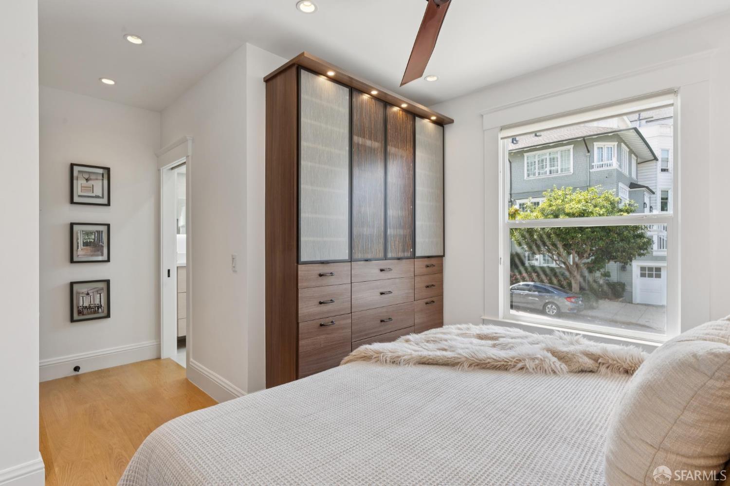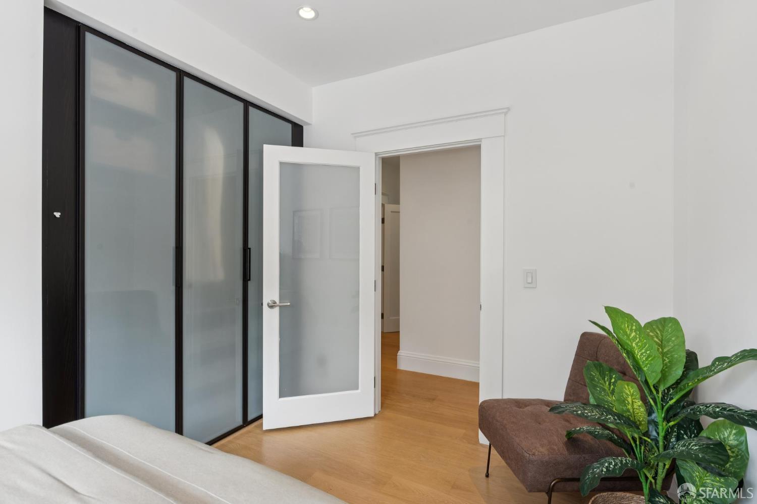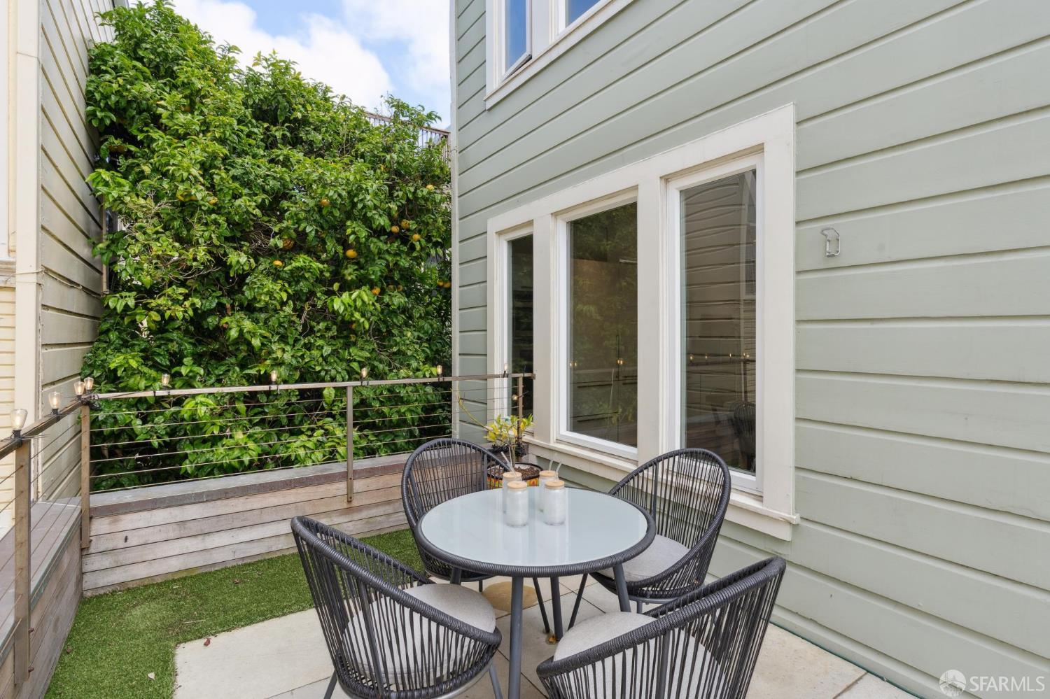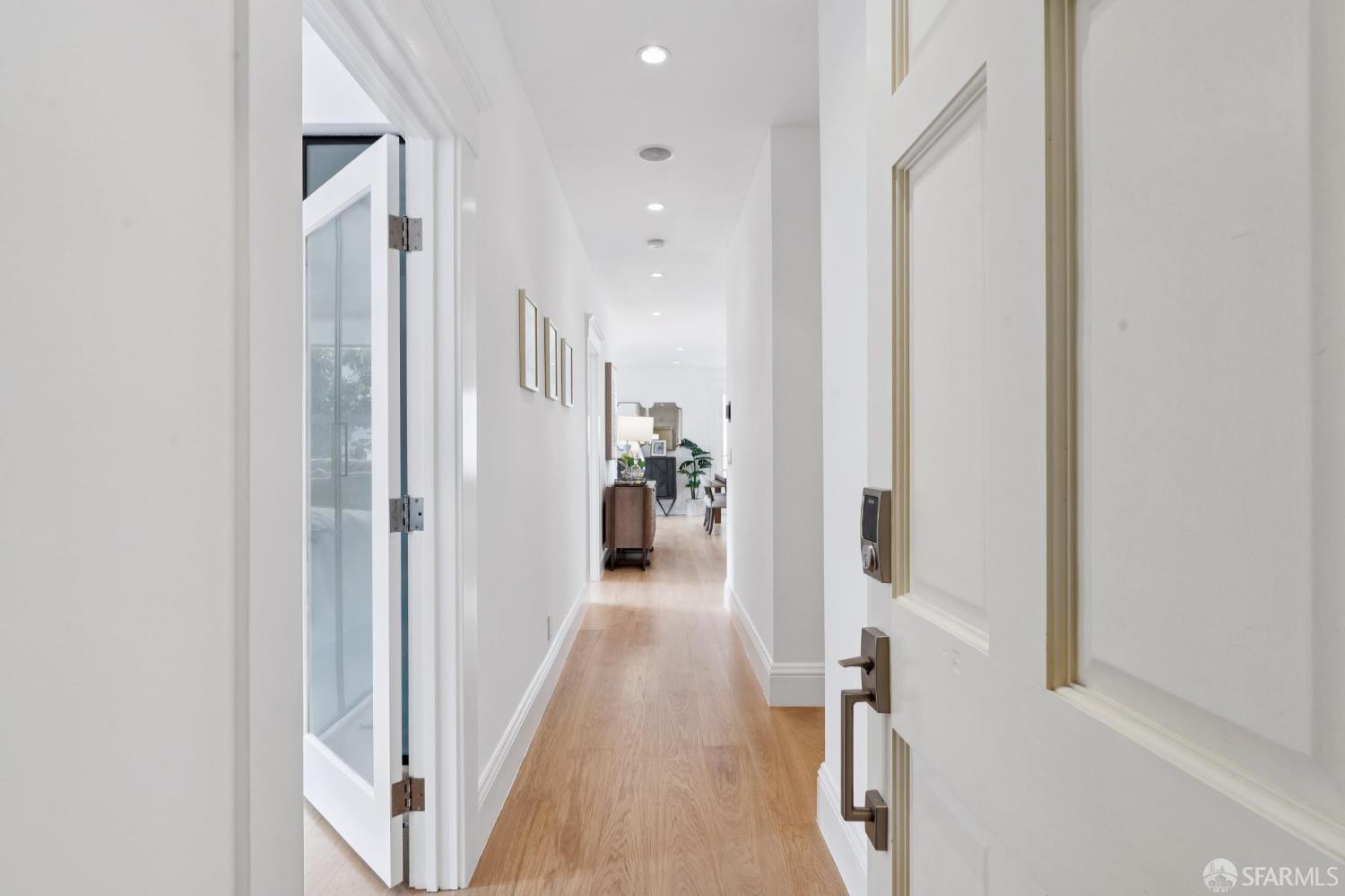 This sophisticated Cow Hollow TIC offers 2 bedrooms, 2 bathrooms, and an open entertainment-style layout steps from the boutique shopping, dining, and nightlife of Union and Fillmore Streets. Uniquely, the residence enjoys the exceptional privilege of a deeded walk-out patio, seamlessly extending the living space outdoors. This home has been thoughtfully upgraded with bespoke, high-end finishes throughout. The kitchen stands as a centerpiece, enhanced with quartzite Taj Mahal countertops, a new range, and a full Bosch appliance suite. An expanded deep sink and generous island with an integrated dining table anchor the space, creating a true gathering hub where the kitchen, living, and dining areas flow together in perfect harmony. The private quarters are equally refined. The primary suite bath has been fully reimagined with custom finishes and a large shower over tub while the hallway guest bath impresses with a custom vanity and a walk-in shower. Additional enhancements include wide-plank white oak hardwood floors, double-pane French doors leading to the spacious patio, dual-zone radiant heating, recessed lighting, built-in Sonos speakers, in-unit washer and dryer, one car parking, and generous storage. The building underwent a soft-story seismic retrofitting in 2018.
