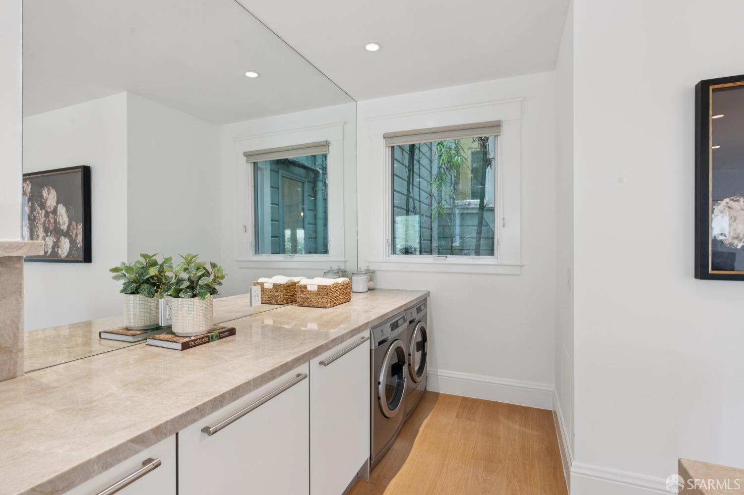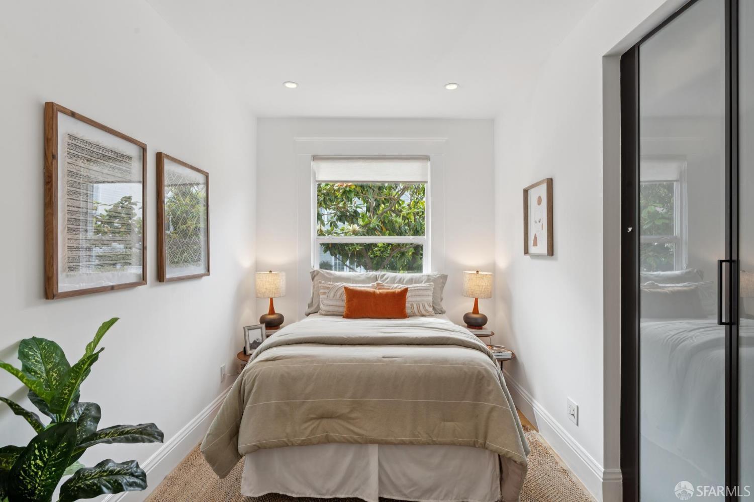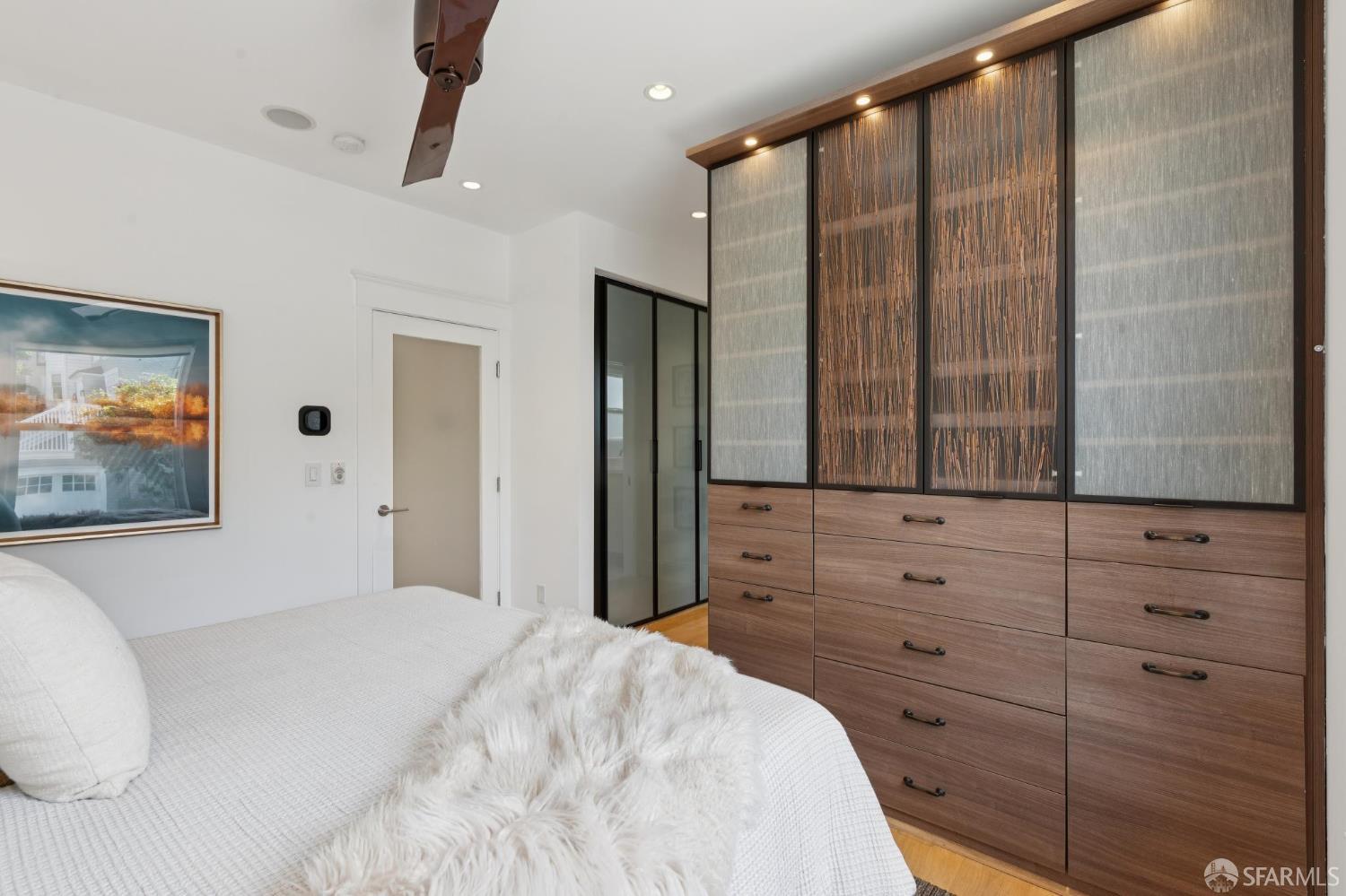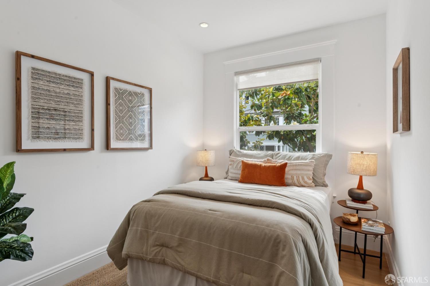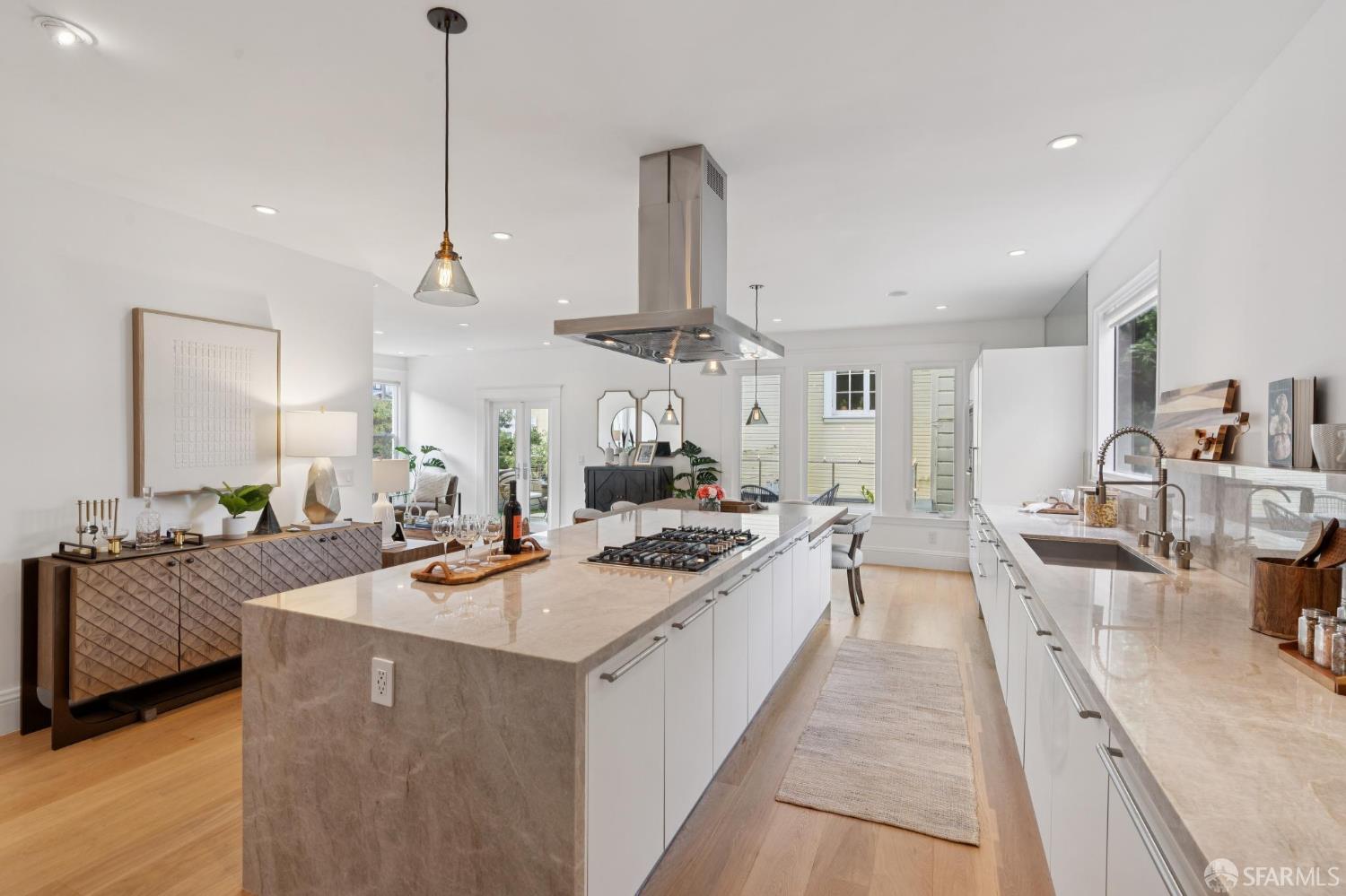 This sophisticated Cow Hollow TIC offers 2 bedrooms, 2 bathrooms, and an open entertainment-style layout steps from the boutique shopping, dining, and nightlife of Union and Fillmore Streets. Uniquely, the residence enjoys the exceptional privilege of a deeded walk-out patio, seamlessly extending the living space outdoors. This home has been thoughtfully upgraded with bespoke, high-end finishes throughout. The kitchen stands as a centerpiece, enhanced with quartzite Taj Mahal countertops, a new range, and a full Bosch appliance suite. An expanded deep sink and generous island with an integrated dining table anchor the space, creating a true gathering hub where the kitchen, living, and dining areas flow together in perfect harmony. The private quarters are equally refined. The primary suite bath has been fully reimagined with custom finishes and a large shower over tub while the hallway guest bath impresses with a custom vanity and a walk-in shower. Additional enhancements include wide-plank white oak hardwood floors, double-pane French doors leading to the spacious patio, dual-zone radiant heating, recessed lighting, built-in Sonos speakers, in-unit washer and dryer, one car parking, and generous storage. The building underwent a soft-story seismic retrofitting in 2018.