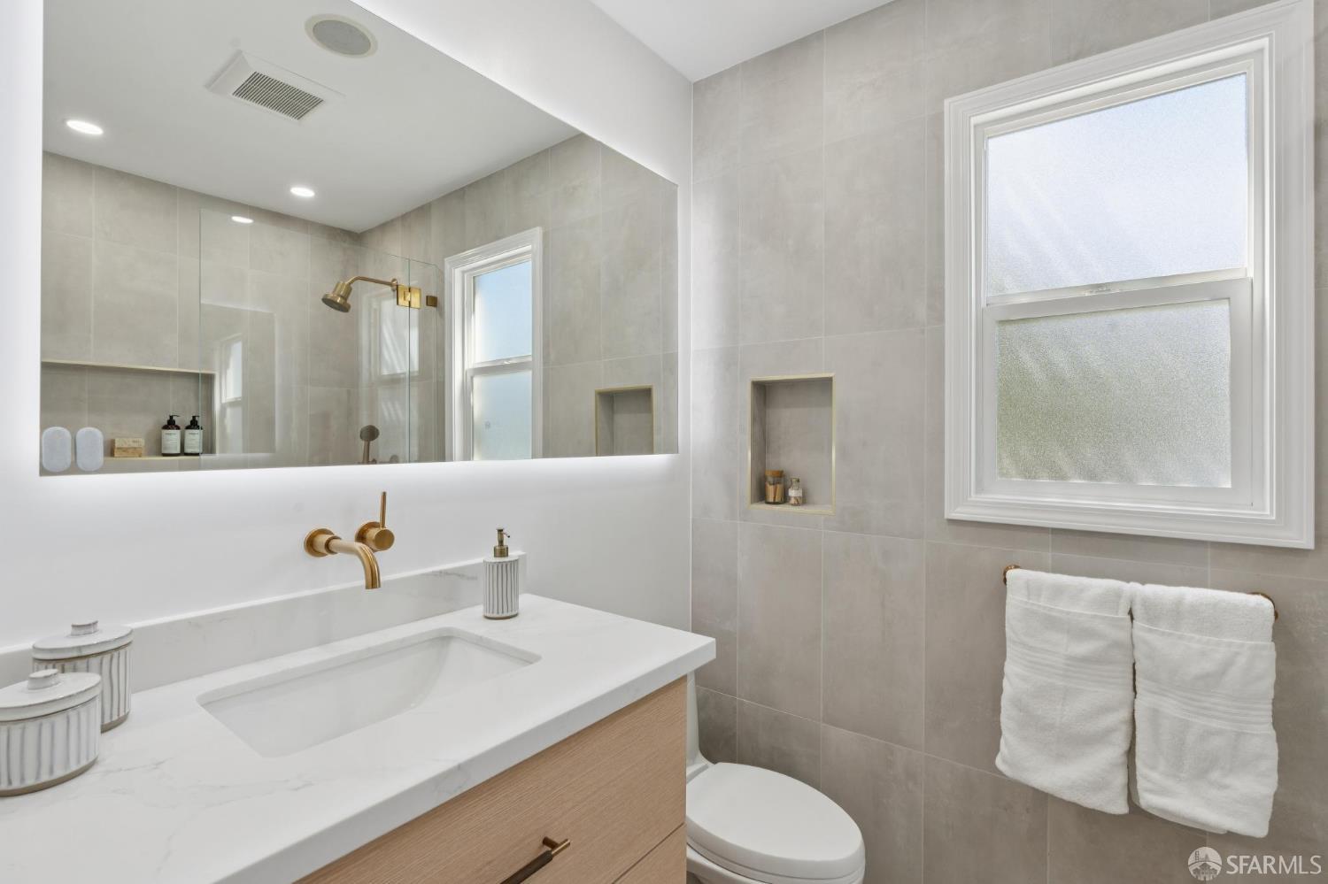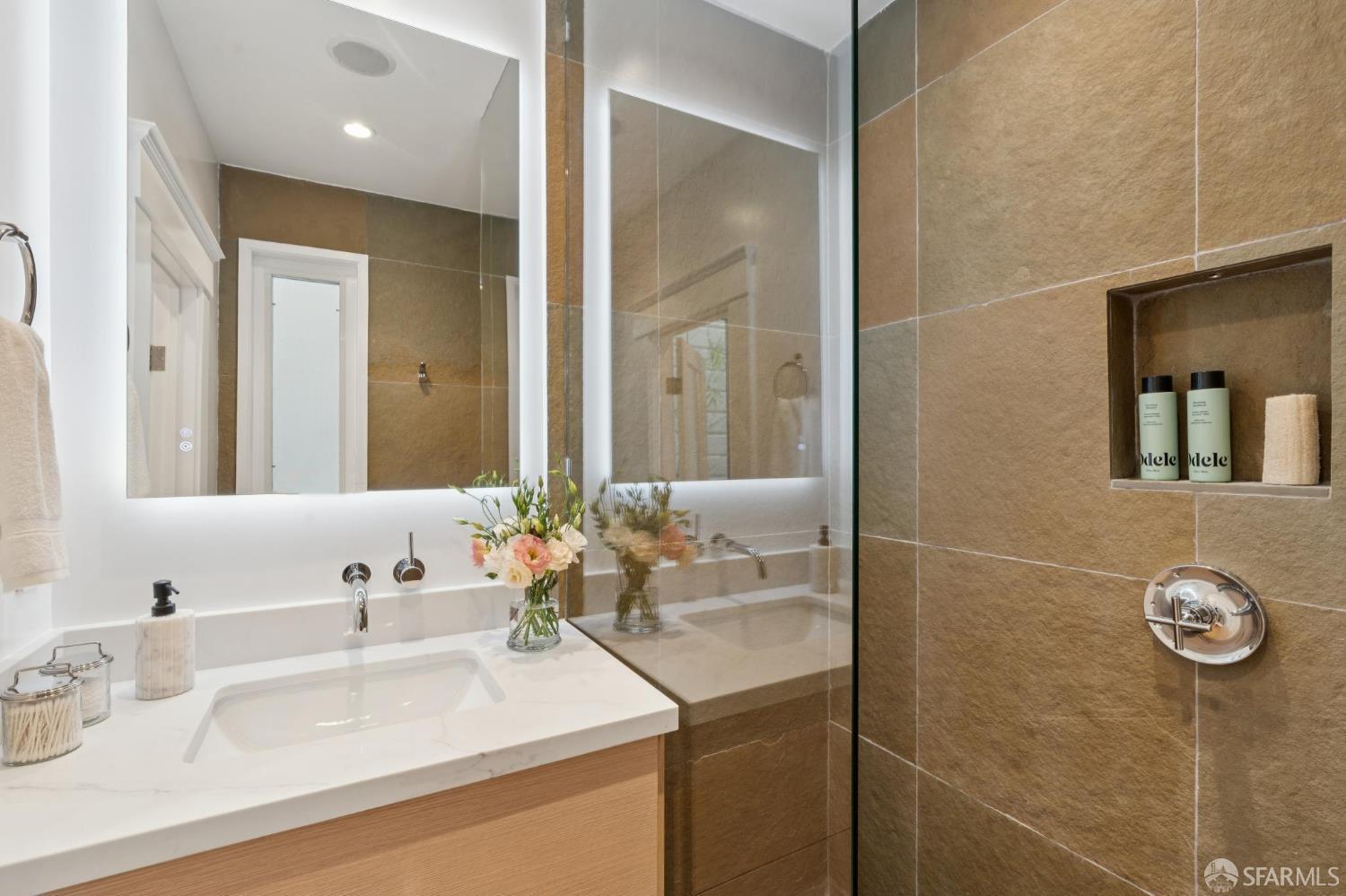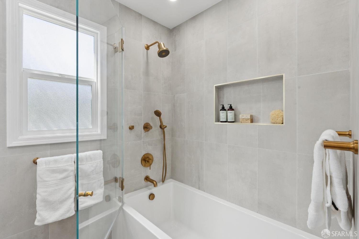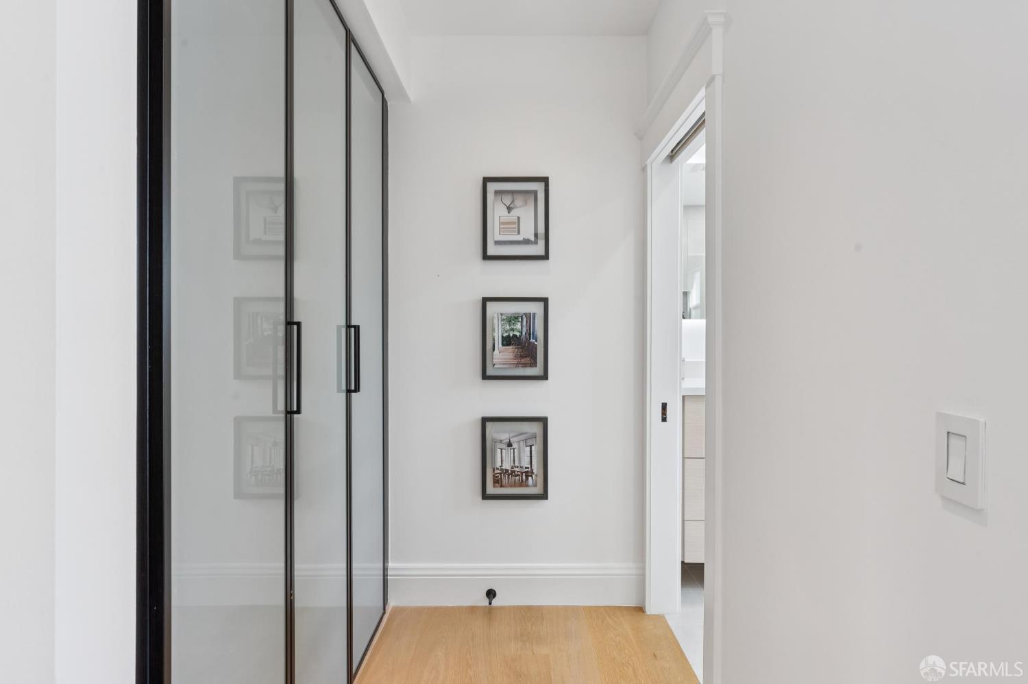 This sophisticated Cow Hollow TIC offers 2 bedrooms, 2 bathrooms, and an open entertainment-style layout steps from the boutique shopping, dining, and nightlife of Union and Fillmore Streets. Uniquely, the residence enjoys the exceptional privilege of a deeded walk-out patio, seamlessly extending the living space outdoors. This home has been thoughtfully upgraded with bespoke, high-end finishes throughout. The kitchen stands as a centerpiece, enhanced with quartzite Taj Mahal countertops, a new range, and a full Bosch appliance suite. An expanded deep sink and generous island with an integrated dining table anchor the space, creating a true gathering hub where the kitchen, living, and dining areas flow together in perfect harmony. The private quarters are equally refined. The primary suite bath has been fully reimagined with custom finishes and a large shower over tub while the hallway guest bath impresses with a custom vanity and a walk-in shower. Additional enhancements include wide-plank white oak hardwood floors, double-pane French doors leading to the spacious patio, dual-zone radiant heating, recessed lighting, built-in Sonos speakers, in-unit washer and dryer, one car parking, and generous storage. The building underwent a soft-story seismic retrofitting in 2018.