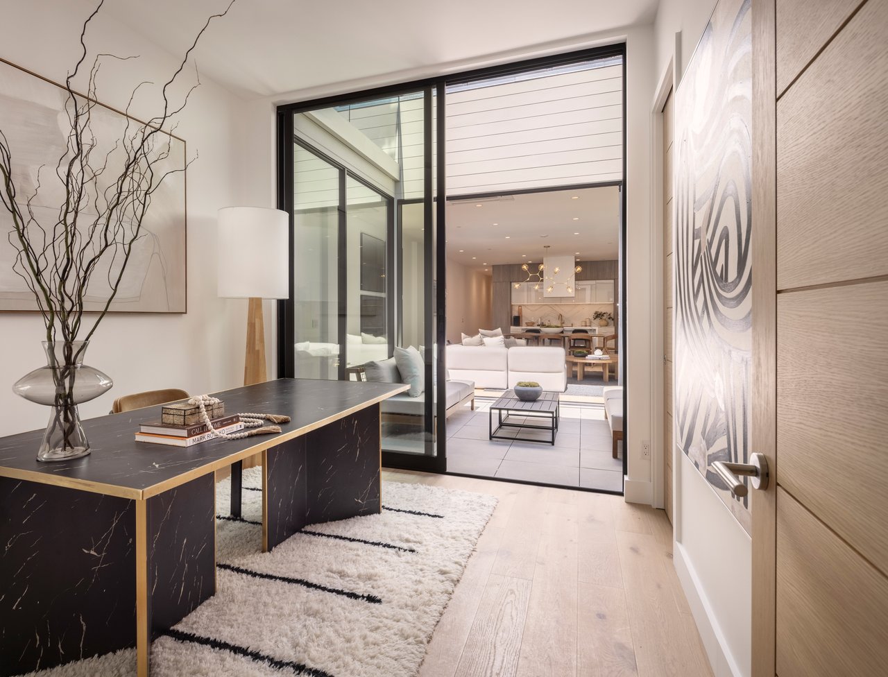 Off the lower hall is a second bedroom served by the artfully outfitted hallway bath. This space makes for the perfect home office and has a floor-to-ceiling slide that opens to the Atrium.