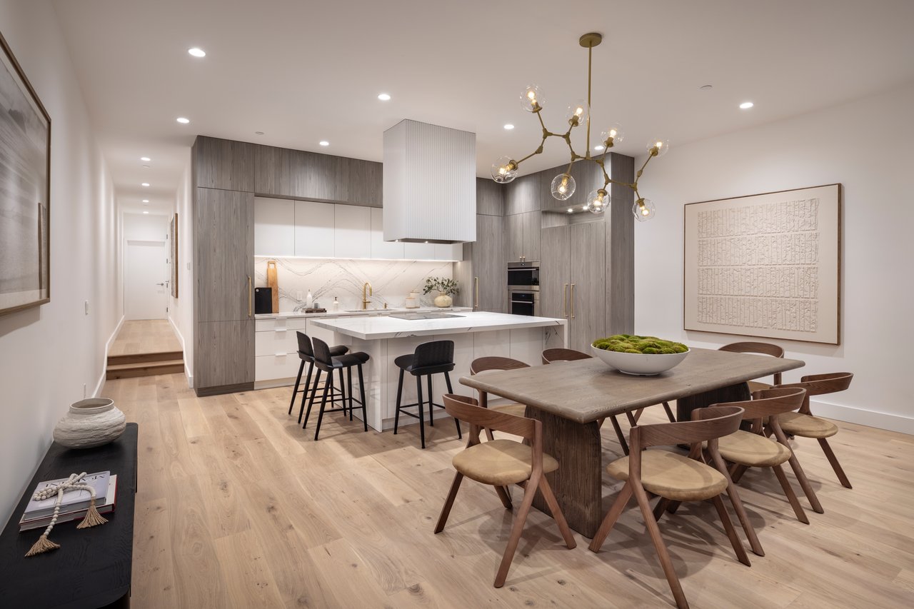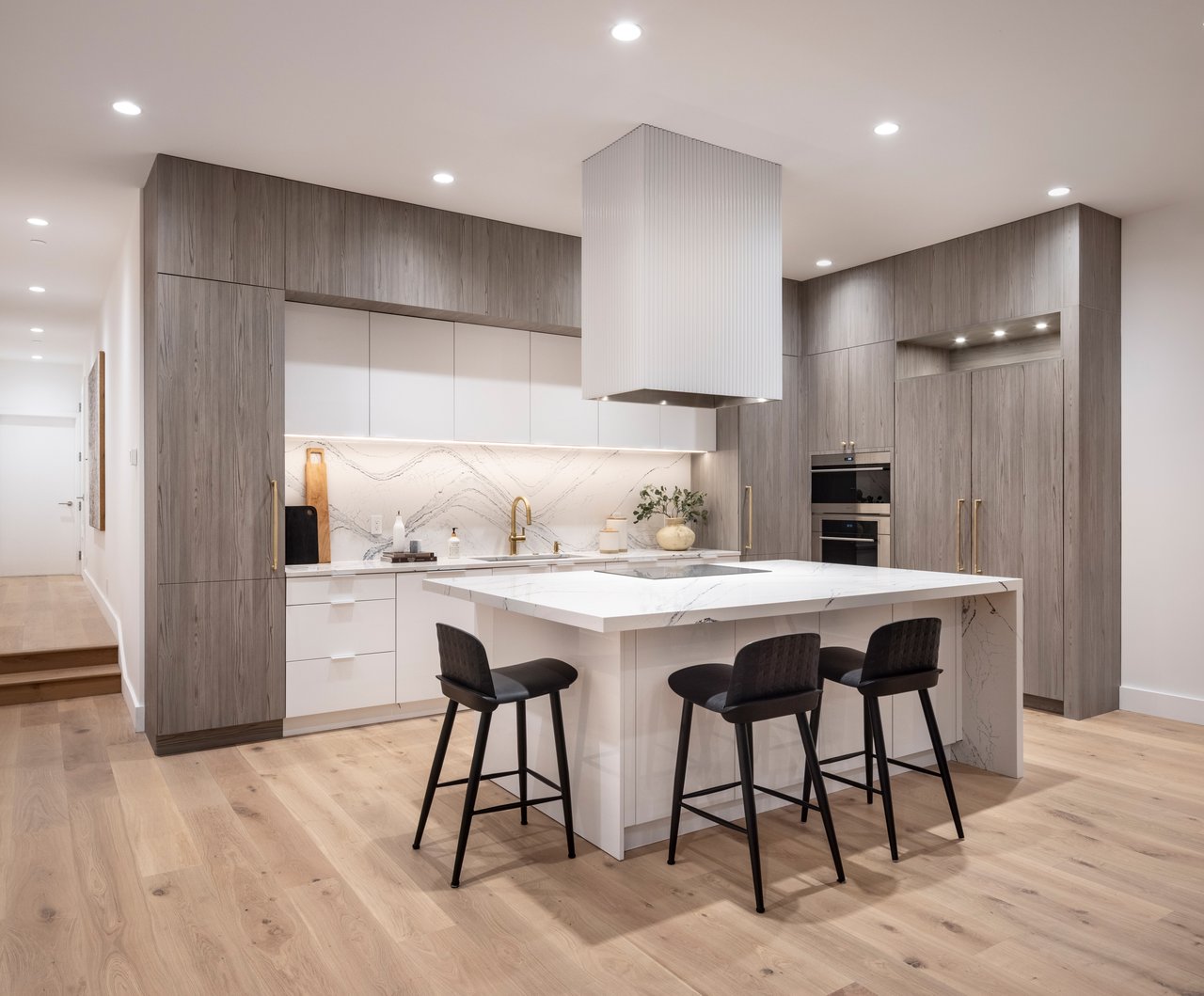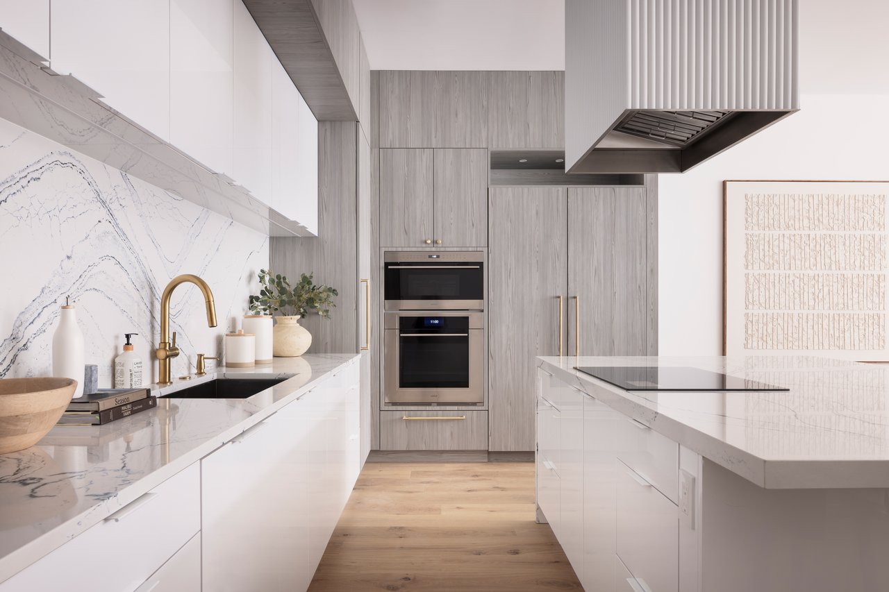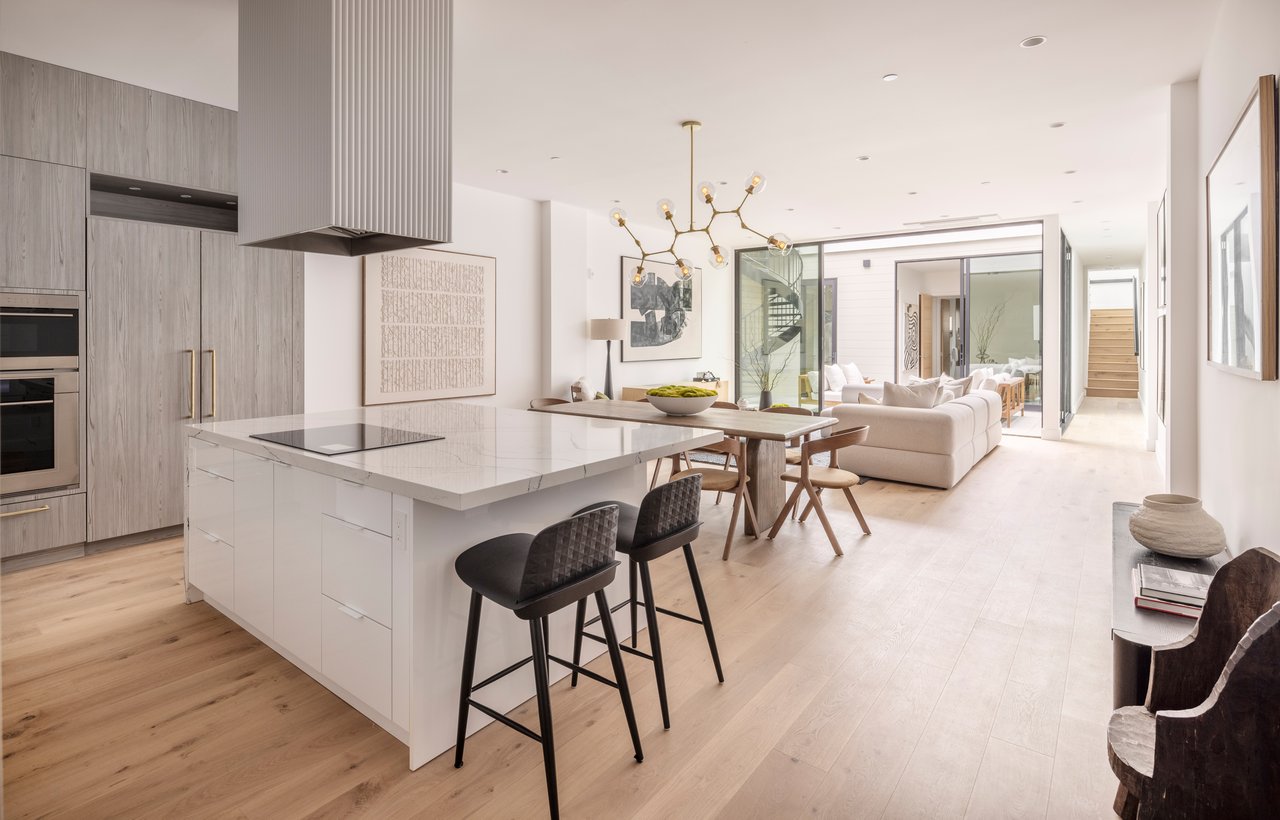 The main level opens to a generously scaled kitchen, dining, and living space where luxury materials meet practical performance. The kitchen cabinetry is a handsome two-toned composition: textured gray wood grain and smooth white lacquer, creating a stylish contrast. The backsplash and countertops are unified in Cambria’s Portrush quartz with distinctive blue veining. An oversized island offers breakfast bar seating on two sides, complemented by premium appliances including Wolf induction cooktop, dual Wolf ovens, SubZero side-by-side refrigerator, and a Cove dishwasher. The range hood is clad in ribbed wood, adding subtle vertical texture and refinement above the island.