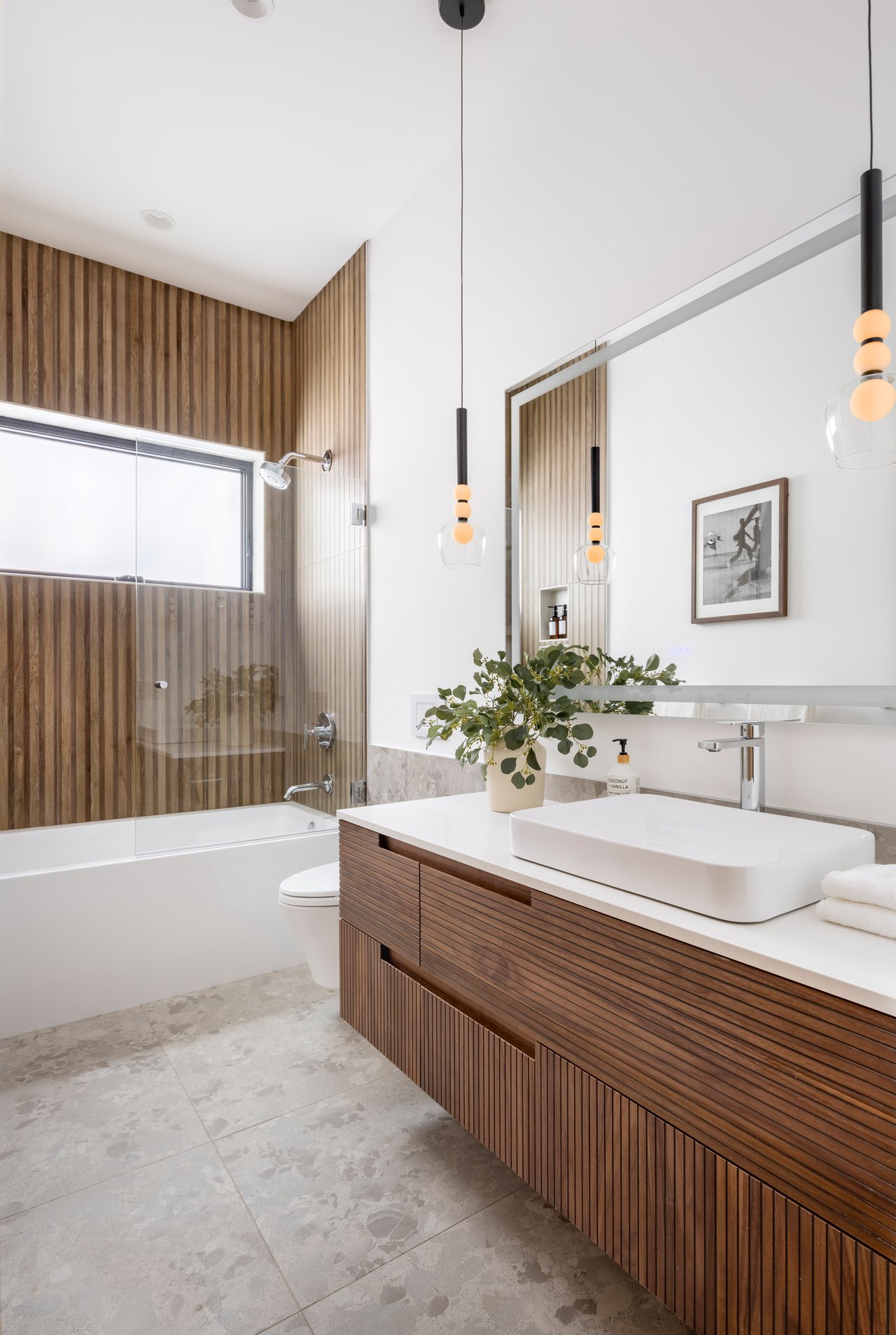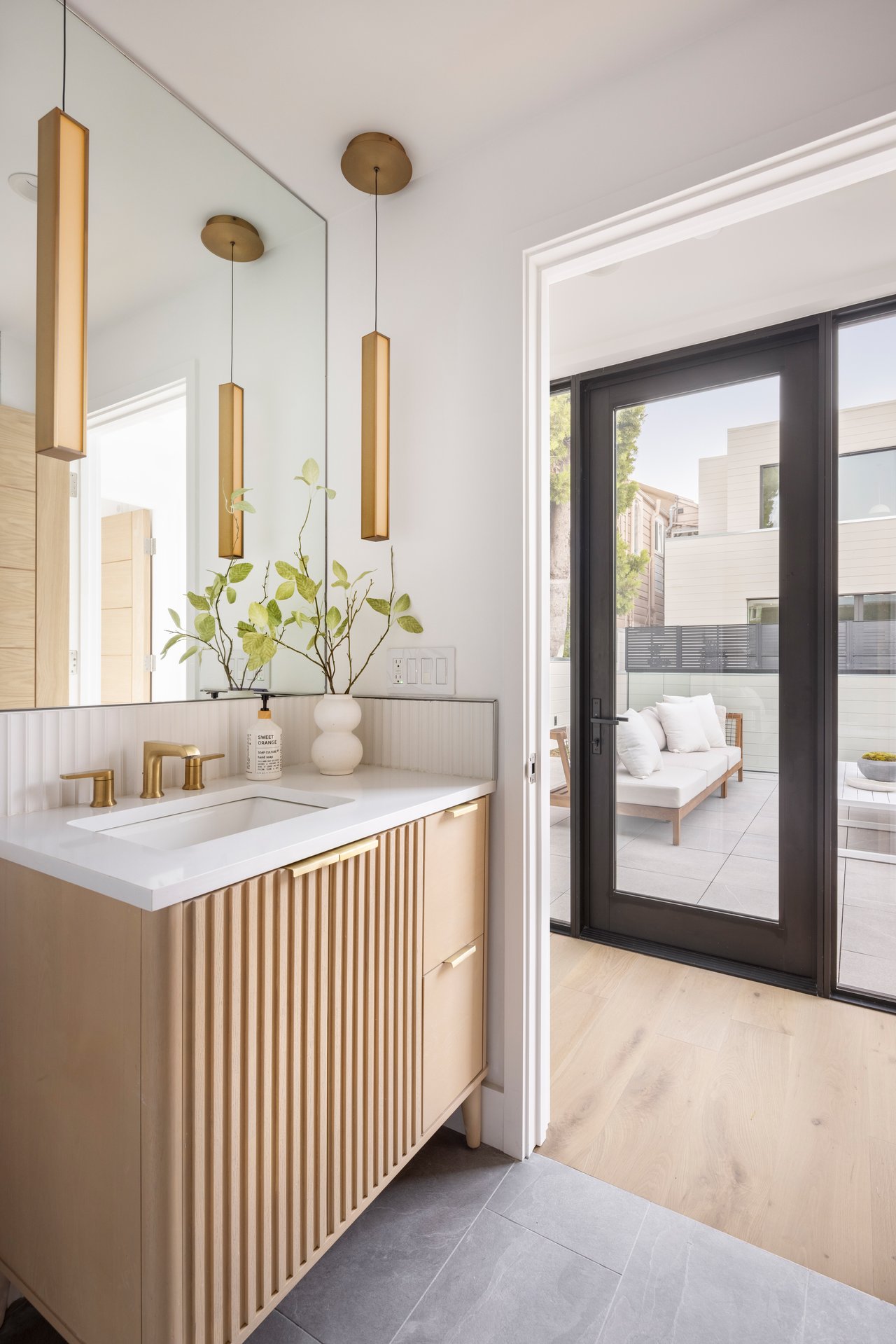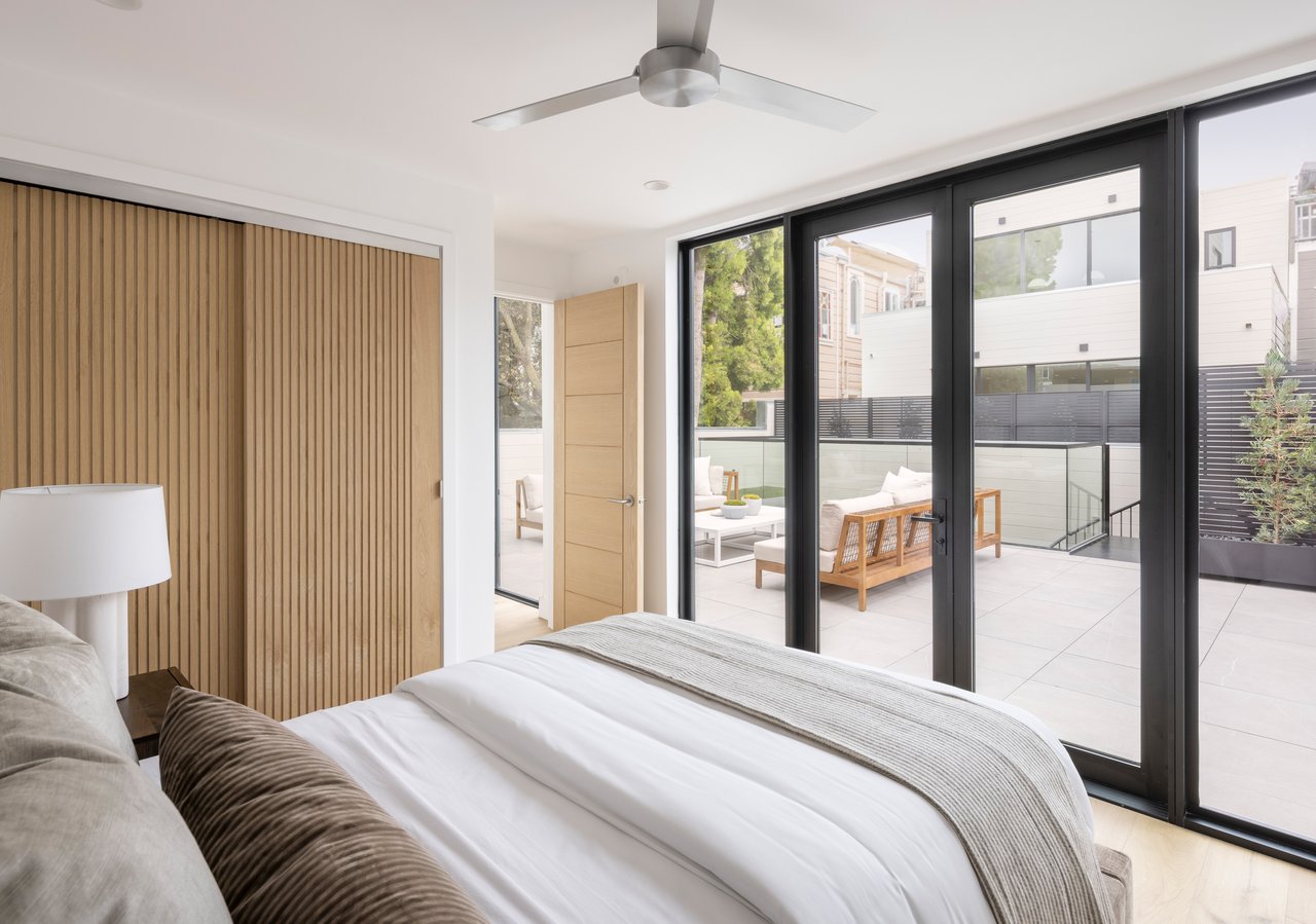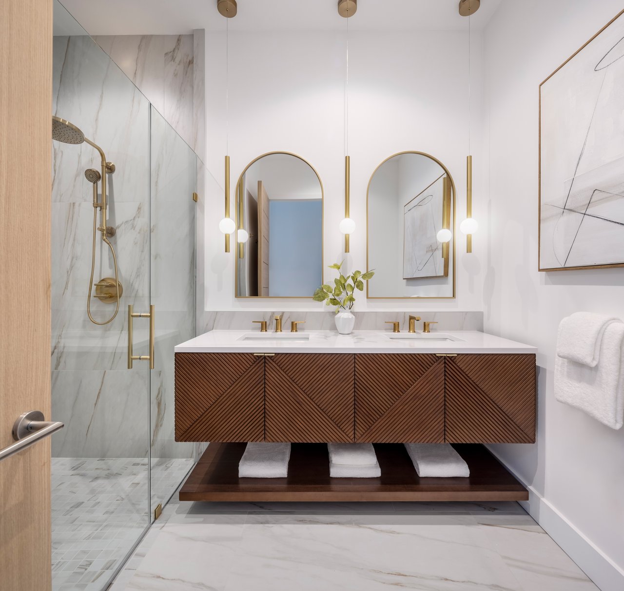 The primary suite is tucked away at the rear of the home for maximal privacy, offering a nice separation from the main living space. It comfortably fits a king-sized bed, includes a walk-in closet with built-in organizers, and opens to a private porch for morning light and quiet moments. The ensuite bath features an oversized walk-in shower clad in large-format porcelain, floating double vanities with diagonal fluted cabinet fascia, brass Kohler fixtures, and a Toto dual-flush toilet.