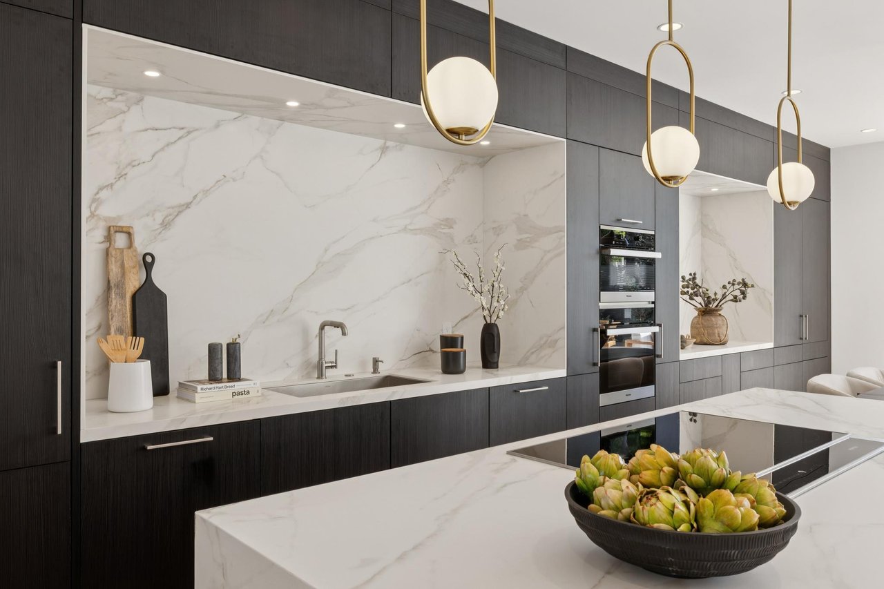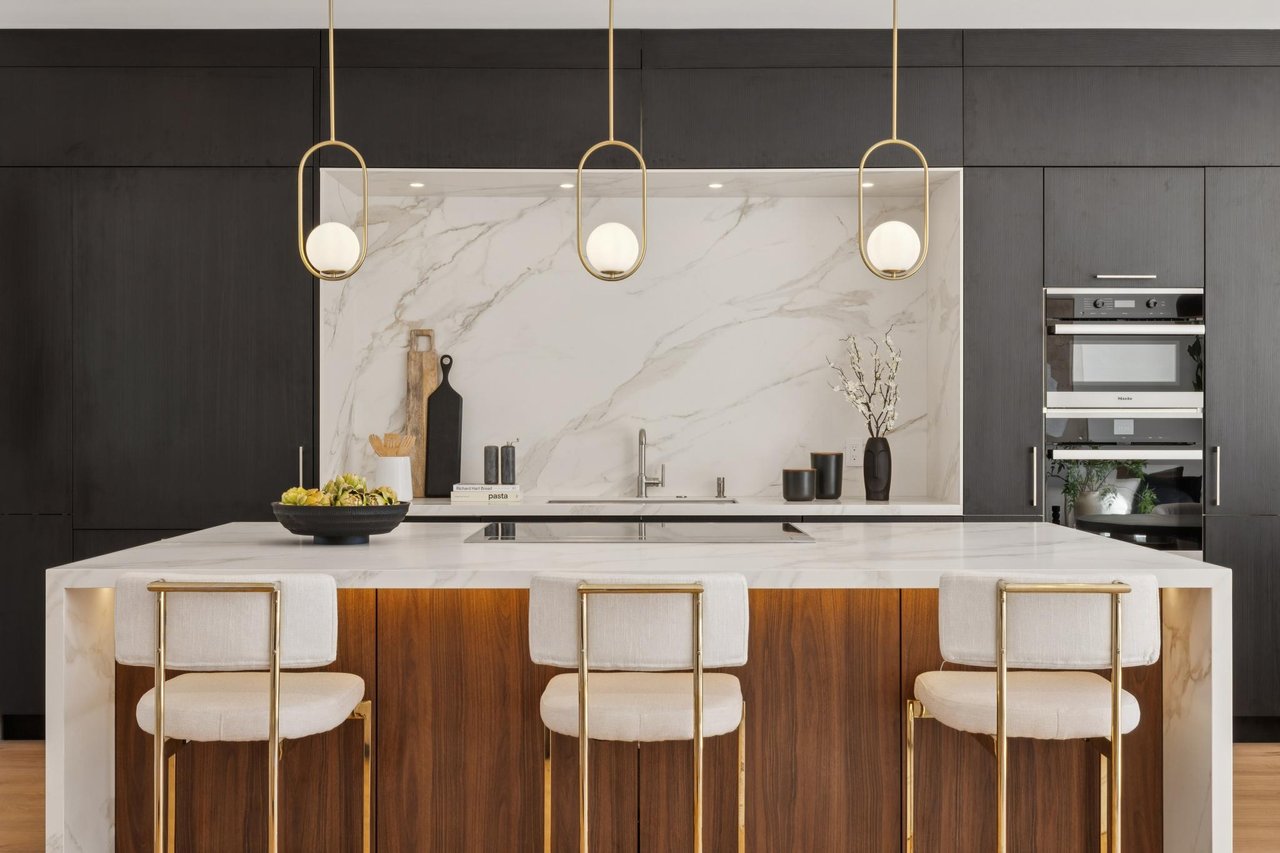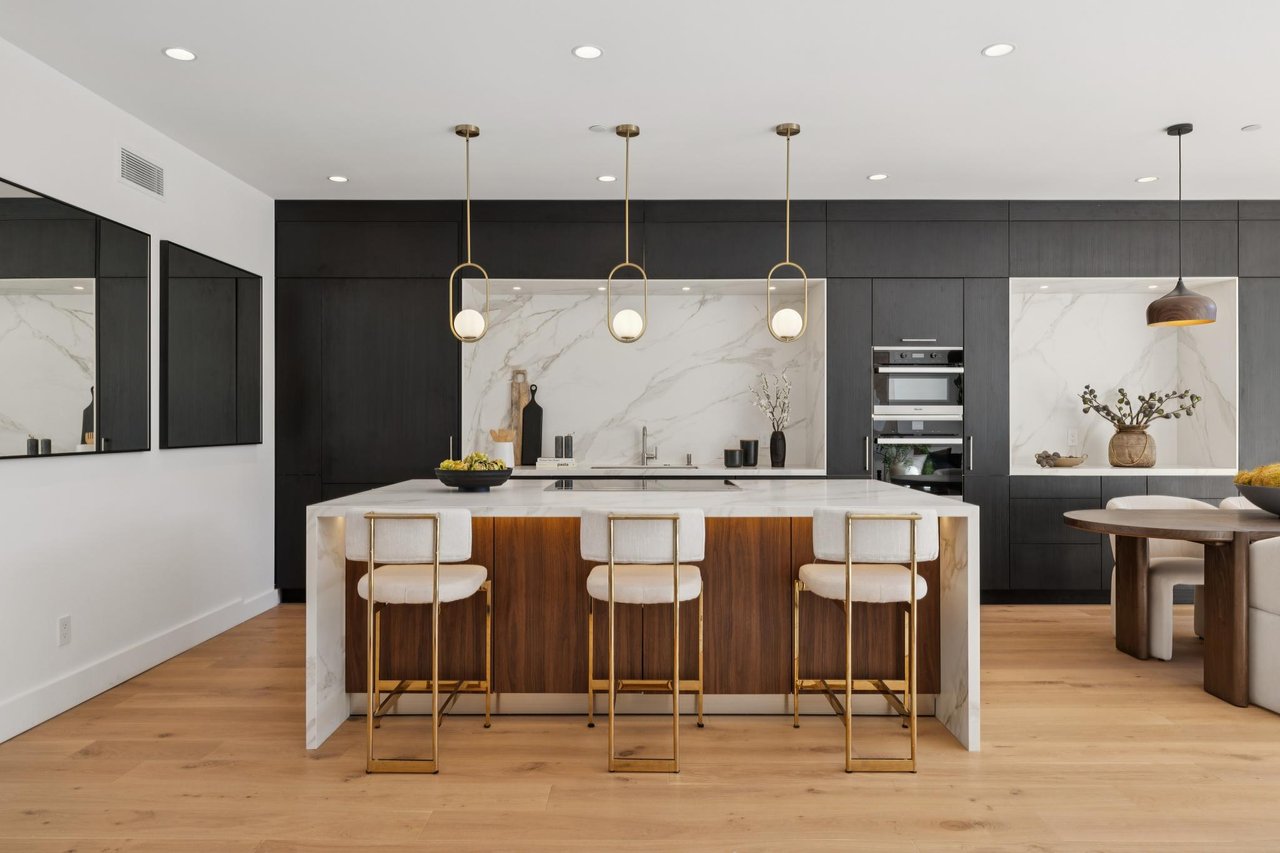 The heart of the home is an open-concept great room with living, dining, and kitchen flowing together across wide-plank oak floors. Floor-to-ceiling glass sliders lead to a private rear deck with filtered sky views, while bay windows at the front fill the space with natural light. The kitchen is centered around a sculptural island clad in porcelain slab with Calacatta-style veining, complemented by a matching backsplash, Sterling sink, and brass fixtures. A full suite of Miele appliances—including induction cooktop, dual wall ovens, refrigerator, and dishwasher—are built into BauBox cabinetry, known for its clean, handle-free design and soft-close systems. A trio of warm wood pendant lights brings softness and architectural detail to the dining area.