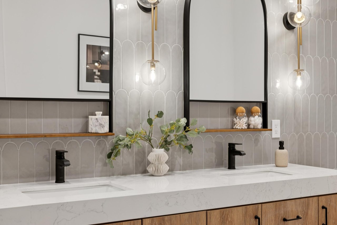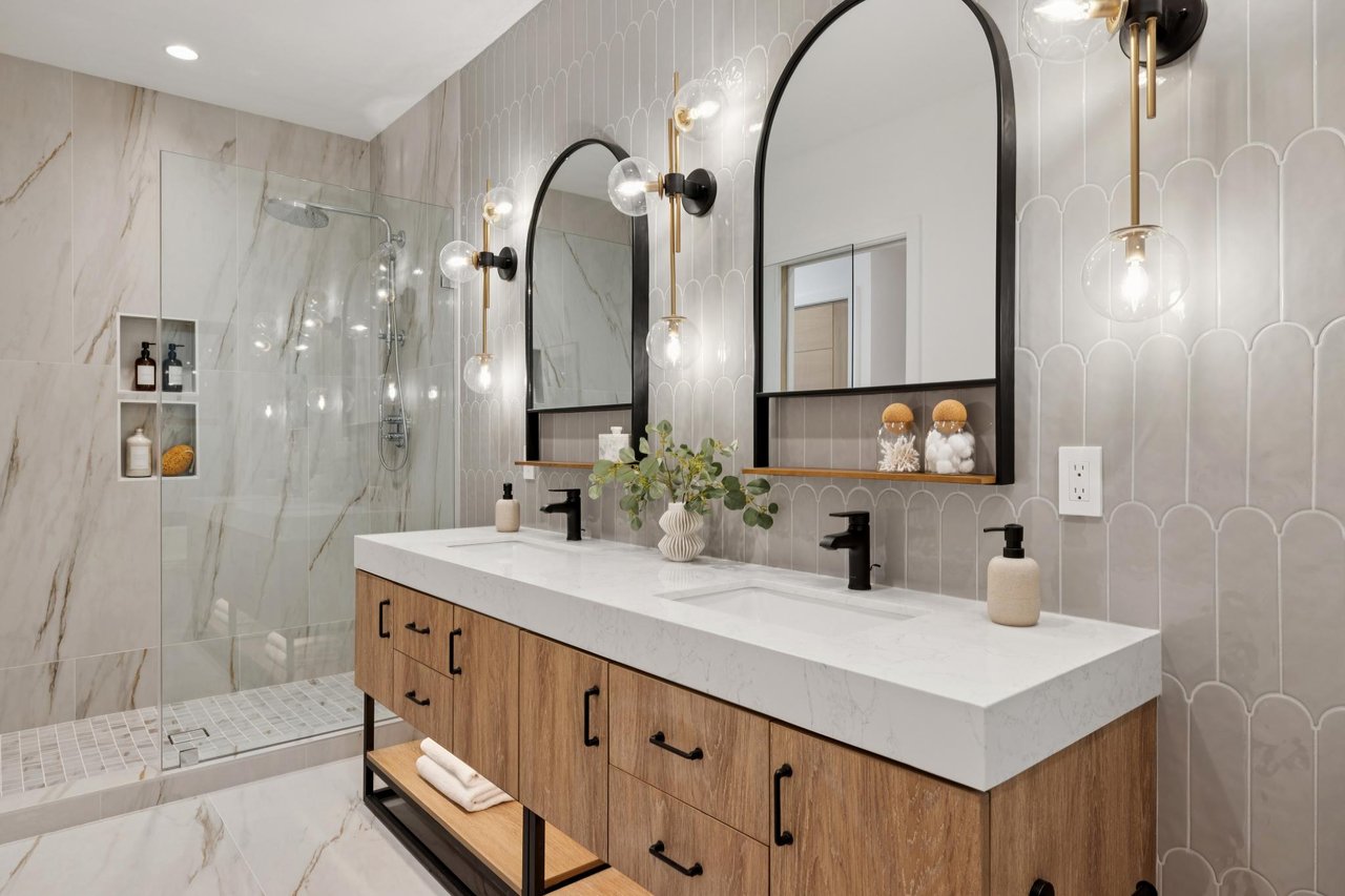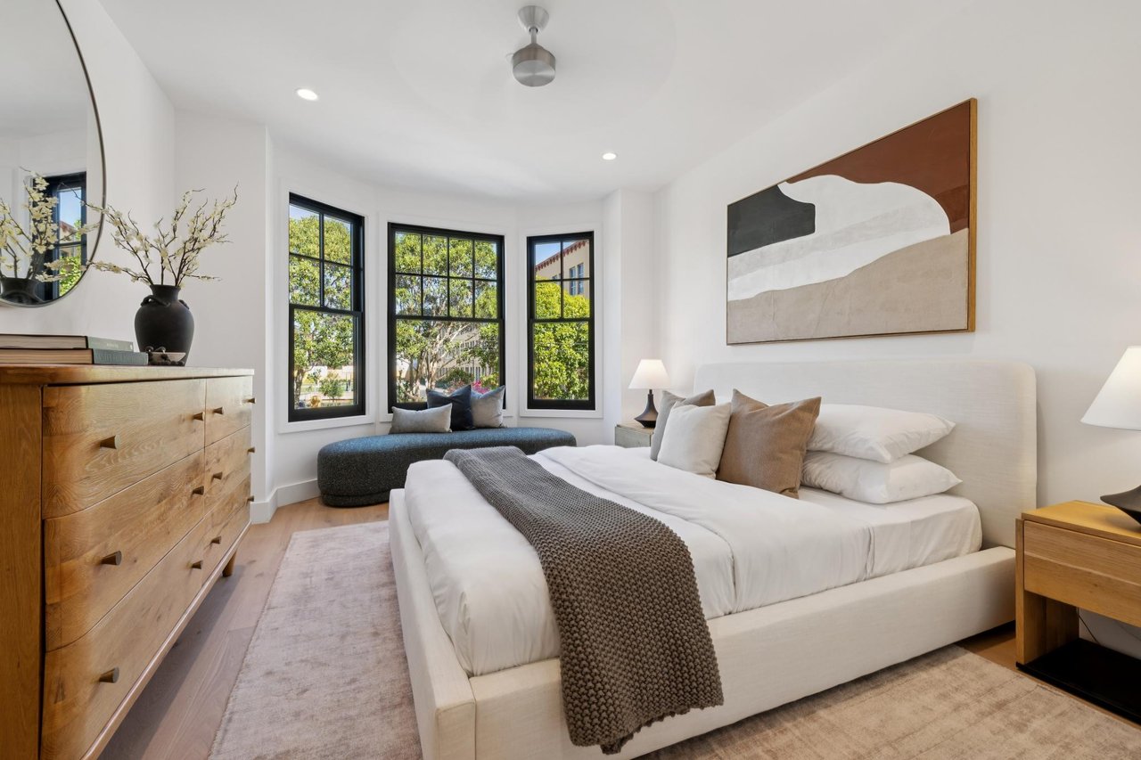 The primary suite includes bay windows, dual closets with built-ins, and an ensuite bath with floating dual vanities, fish-scale tilework, Kohler brass fixtures, a glass-enclosed walk-in shower, and a Toto dual-flush toilet. A second bedroom shares similar proportions and sunlight, while a third bedroom—perfect as a guest suite or home office—sits near the hallway bath, which includes a shower-over-tub, floating vanity, and stylish lighting.