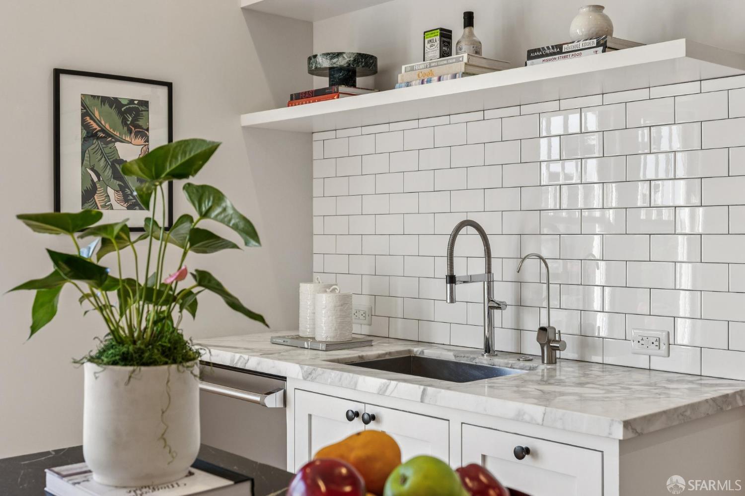 Welcome to 95 6th Avenue, a top-floor corner Edwardian in a charming 6-unit building in the Lake Street District. This elegant 3BR/2BA + office residence blends period detail with modern upgrades. Grand public rooms feature box-beam ceilings, intricate moldings, picture rails, and inlaid oak floors. The living room includes a fireplace and leaded glass windows with Lake Street views. The dining room stuns with rare beam detail, a Sputnik chandelier, and southern outlooks to Sutro Tower. The remodeled kitchen offers Viking appliances, statuary marble counters, subway tile backsplash, floating shelves, and a custom coffee station. A dedicated bar area includes a wine fridge, and the adjacent laundry room has LG front-loading machines. Baths feature Duravit/Toto fixtures, marble finishes, subway tile, and penny/hex tile floors. Other highlights include Lutron dimmers, Nest thermostat, forced air heat, recessed lighting, and a mix of antique and dual-pane windows. One-car private garage + large storage. Steps from Mountain Lake Park, the Presidio, and Slow Street tranquility.